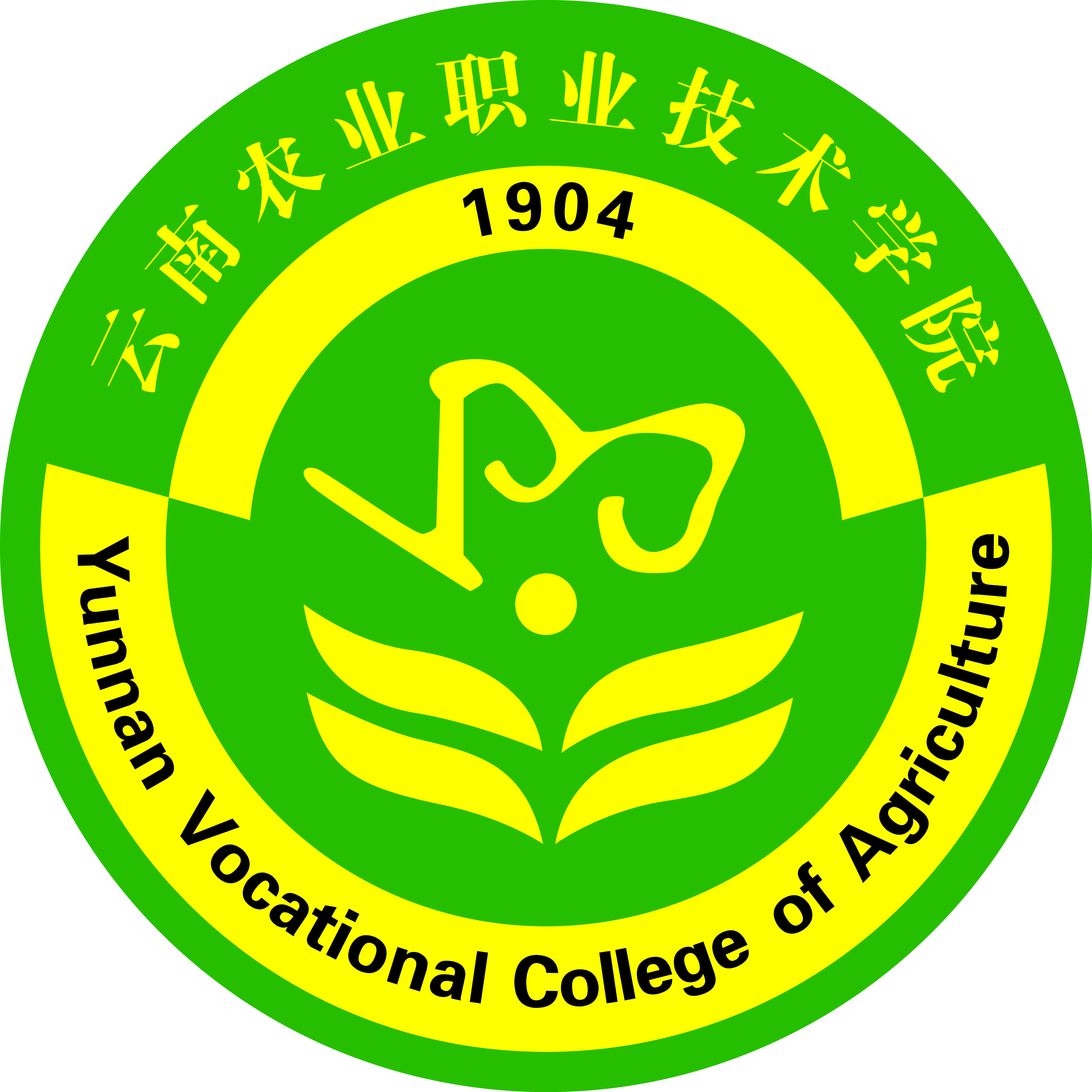 外环上方是中文校名,下方是英文校名。图案中“1904”是学校前身“云南蚕桑学堂”成立的时间。图标的绿叶象征着农业耕作,也象征着莘莘学子破土成长;绿叶之上是绽放的花朵,象征种植业,花朵形似羊角,象征畜牧业,同时还是“100”的艺术数字,象征我们对百年优良传统的自豪与继承。