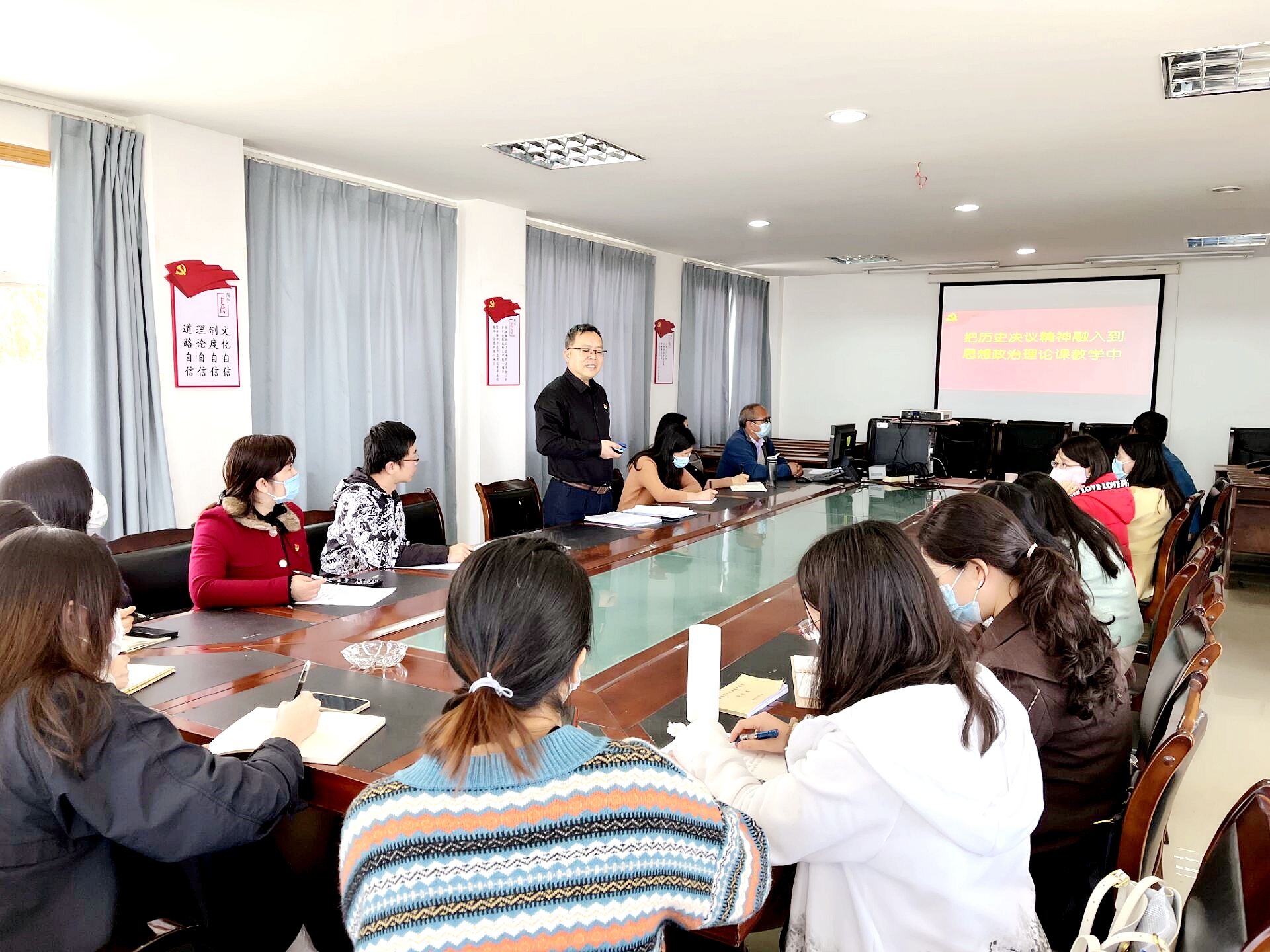 2022年4月20日,党委委员、马克思主义学院党总支书记张建才同志以“把党的历史决议融入到思想政治理论课教学中”为题,对全体思想政治理论课教师讲授了专题党课,并对把党的十九届六中全会精神如何融入到思想政治理论课的教育教学中作出了安排部署。