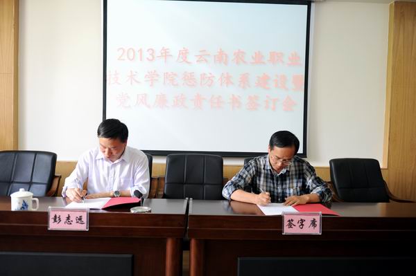 为进一步做好我院2013年度惩防体系建设暨党风廉政建设责任制落实工作,增强广大党员领导干部廉洁从政意识,不断提高制度的约束力和执行力,有力推进反腐败工作得到,为我院改革发展和稳定提供坚强的政治保障。5月24日,在茭菱校区三楼报告厅我院举行了2013年惩防体系建设和落实党风廉政建设责任制责任书签订会。党委书记崔金赋、院长彭志远等院领导,以及各部门正职负责人参加了会议。