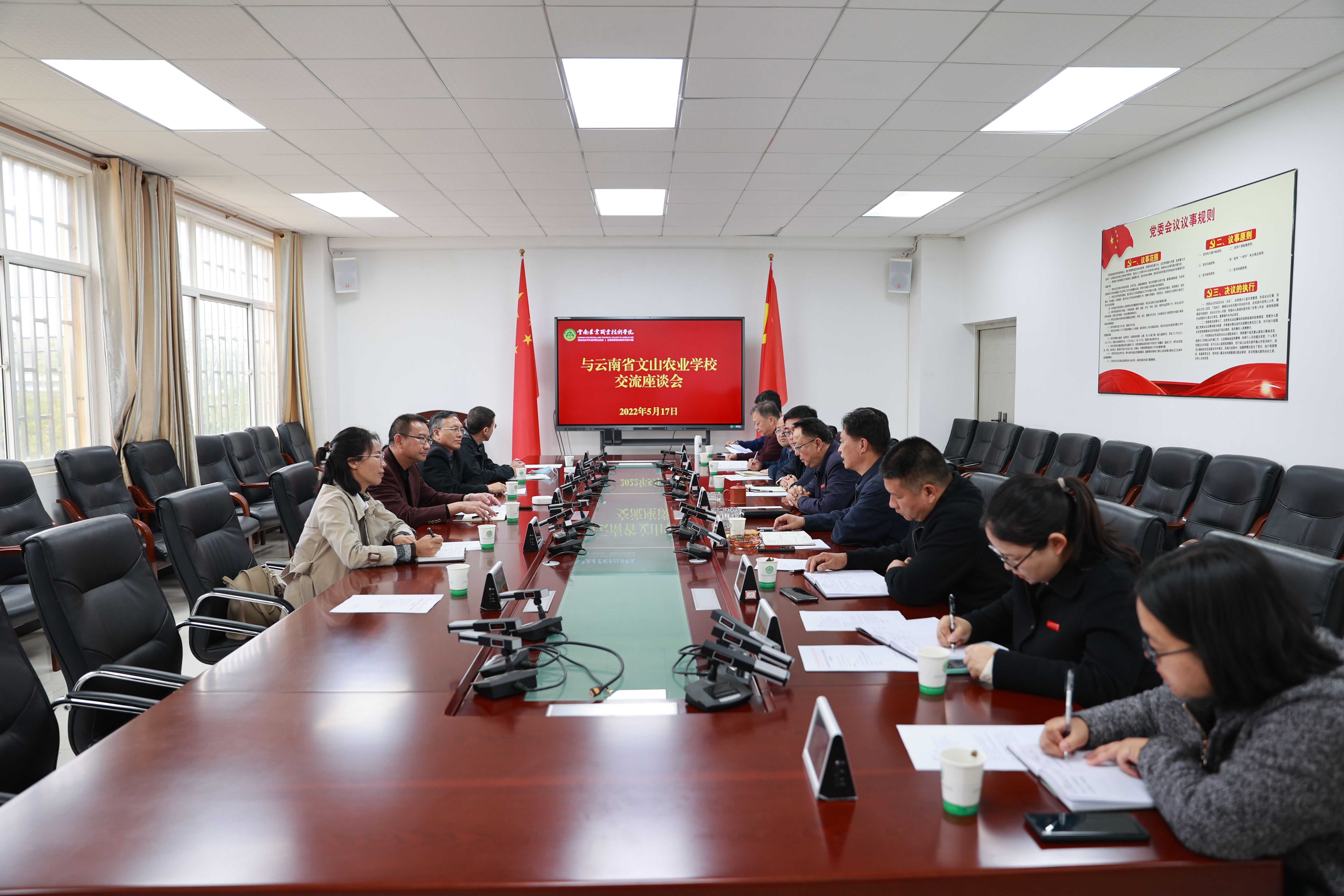 通知中心5月17日上午,云南省文山农业学校校领导率队到我院交流,两校在小哨校区综合楼4楼会议室举行校校合作交流座谈会。我院党委书记文俊、副院长田应华,文山农业学校党委书记、校长侬援,副校长李炳才出席会议,我院办公室、招就处、实践教学中心等部门负责人参会。会议由副院长田应华主持。