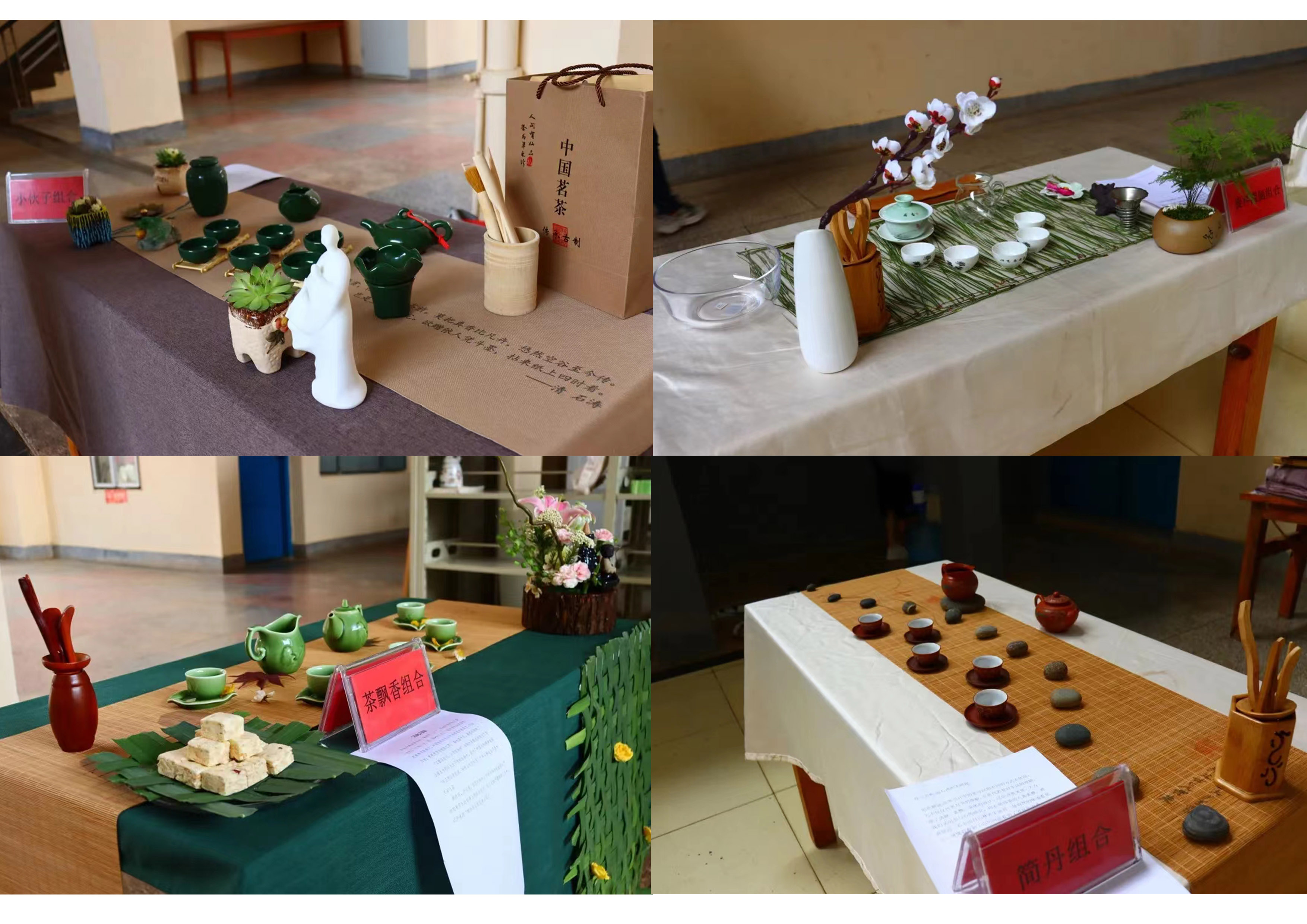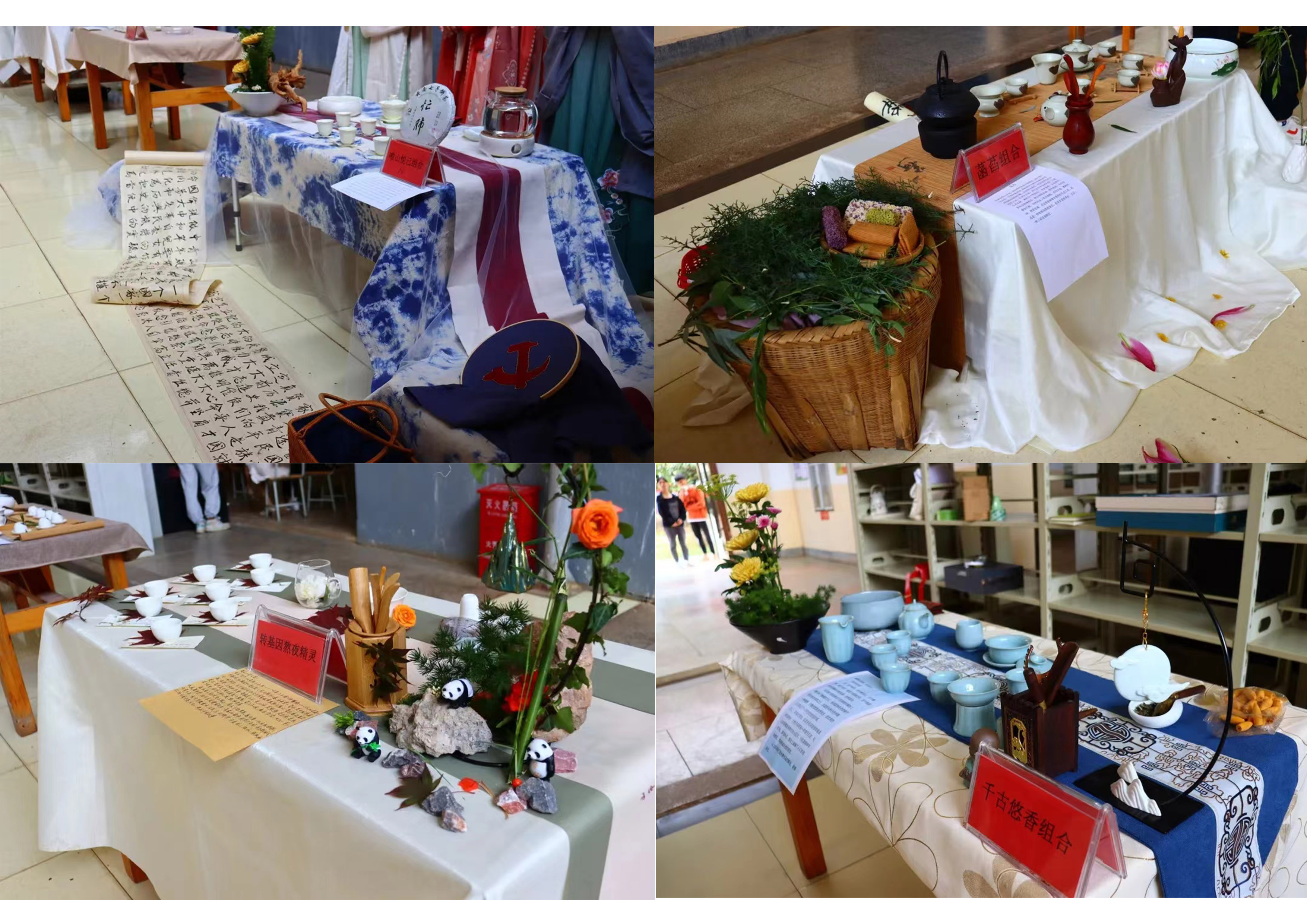 此次比赛共有16组参赛作品,由《茶艺》课程授课教师杨净云老师指导,比赛分为布席、评委评审两个环节。参赛选手将辅材与茶具进行搭配,加入书画,扎染、服装设计等设计元素,形成各具创意、特色的茶席作品。评委们从主题、色调、美观、实用和文案表达等方面进行评分。经过评委们认真细致的评选,最终评选出一等奖2组、二等奖4组、三等奖6组、优秀奖4组。