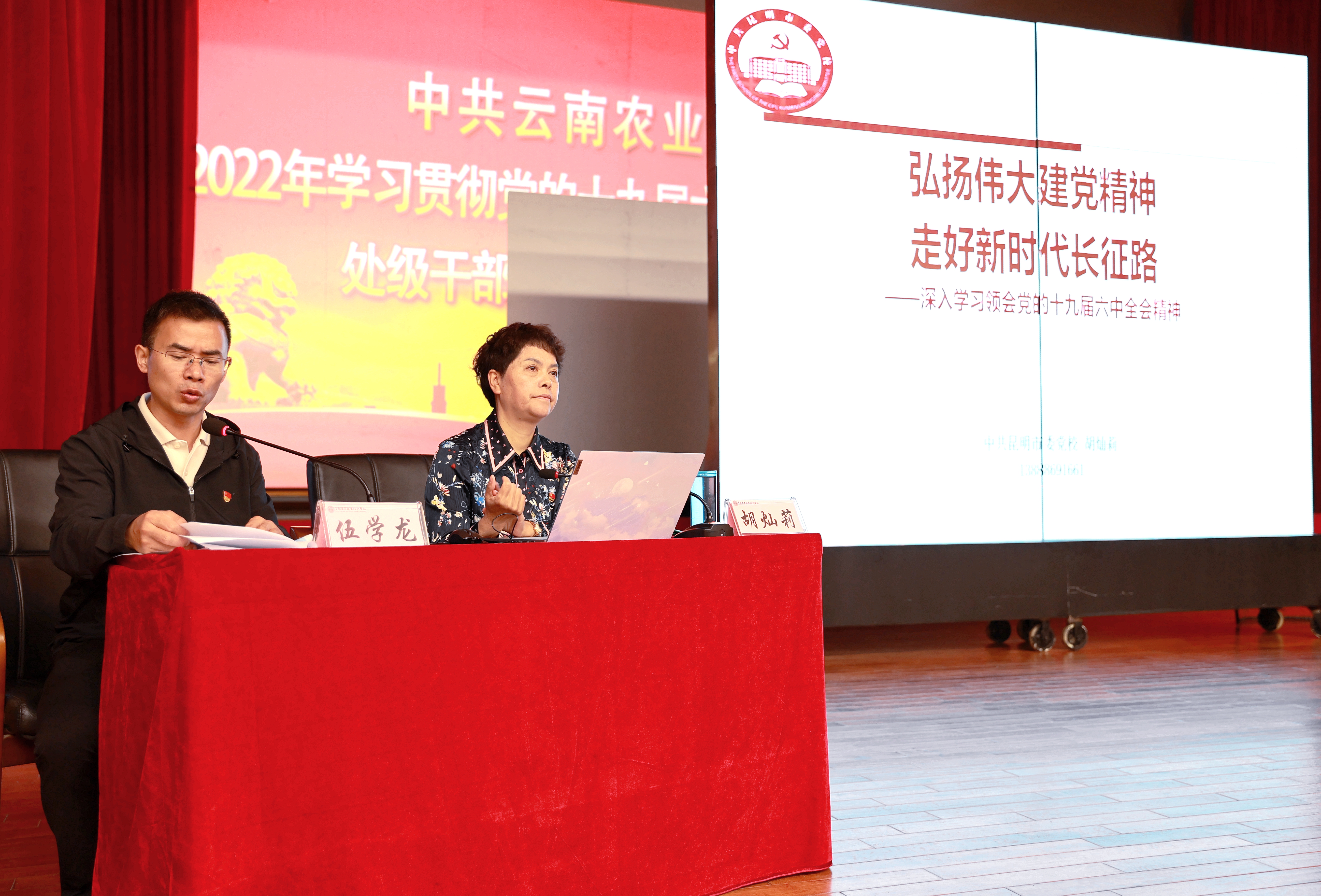 618在茭菱校区A1栋四楼401报告厅,省委党校民族和文化教研部主持工作副主任、副教授王云强同志云南农业大学马克思主义学院党委书记彭德远副教授分别开展了学习贯彻党的十九届六中全会精神坚持马克思主义宗教观  警惕校园非法传教和宗教渗透的专题辅导,并组织自学高校党组织示范微党课——“牢记嘱托,勇毅前行”,进一步提升了领导干部的理论水平政治素养