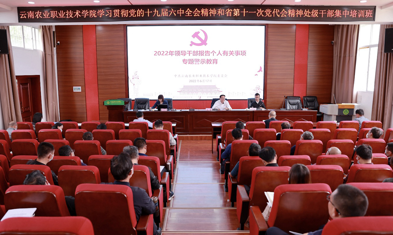 617在学院嘉锐楼阶梯教室,省委教育工委宣讲团成员、昆明学院马克思主义学院缪文武副教授开展以《谱写中国梦的  云南篇章——学习贯彻习近平总书记考察云南重要讲话精神及省第十一次党代会精神》为主题的专题辅导,进一步增强领导干部自觉找准定位、发挥作用,担起责任使命与全省各族人民共同谱写好中国梦云南篇章的决心和信心当天,针对全院副处级及以上领导干部,结合实际,组织开展了领导干部报告个人有关事项专题警示教育,党委书记文俊同志通报了学院近3年开展此项工作的整体情况,从全面从严治党责任、严格执行领导干部个人有关事项报告制度等方面作了重要讲话,对学院开展领导干部个人事项报告自检自查工作进行了安排部署;学院党委副书记伍学龙同志通报了有关选编案例和校内典型案例;组织部有关负责同志对自检自查注意事项进行了讲解。并围绕《中华人民共和国职业教育法》《中华人民共和国民法典》等法律法规开展自学