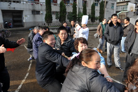 上午的文体活动是职工拔河赛。农业厅20余家直属单位按行业合并共组织了16支代表队,每支拔河队男职工15人、女职工5人共20人,参加竞争激烈的职工拔河比赛。我院由党委书记崔金赋、院长彭志远亲自挂帅,组织了强有力的拔河队伍和鼓舞士气的啦啦队力争夺冠。我院拔河队经过努力以小组第二名挤进4强。在与省保山疫苗厂代表队、省种羊场代表队、厅直属机关代表队、省种畜场代表队的激烈竞争中,我院拔河队经过艰苦鏖战、奋力拼搏夺得拔河赛第二名——亚军的好成绩,比去年的第三名上升了一名。省种畜场代表队获得冠军。
