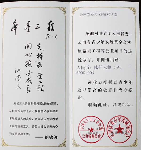 开学之际,校团委向全校团员青年发出倡议,号召捐出自己爱心,发挥共青团的作用,进行1+X爱心水窖援建工作义务捐款,为助推社会公益事业的发展尽自己的绵薄之力。通过爱心捐赠,共筹集捐款陆仟元整。并委托共青团云南省委、云南省青少年发展基金会代为捐赠,分为三个点,共建设72立方体积的水窖,支持耿马县生活生产用水。