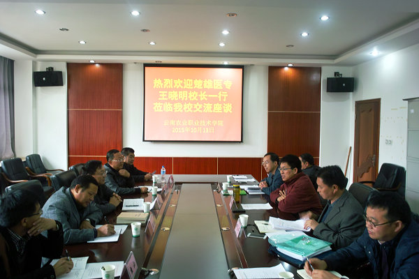 10月13日上午,楚雄医药高等专科学校校长王晓明、副校长昝雪峰、校办主任段玉林、教务处处长熊金成等一行六人莅临beat365官网交流座谈。beat365官网党委书记崔金赋与王晓明校长一行进行了亲切交流,学校院长助理田应华、党(院)办主任金吉斌、教务处处长张江荣、教学督导室主任杨有昌等同志参加了交流座谈会。
