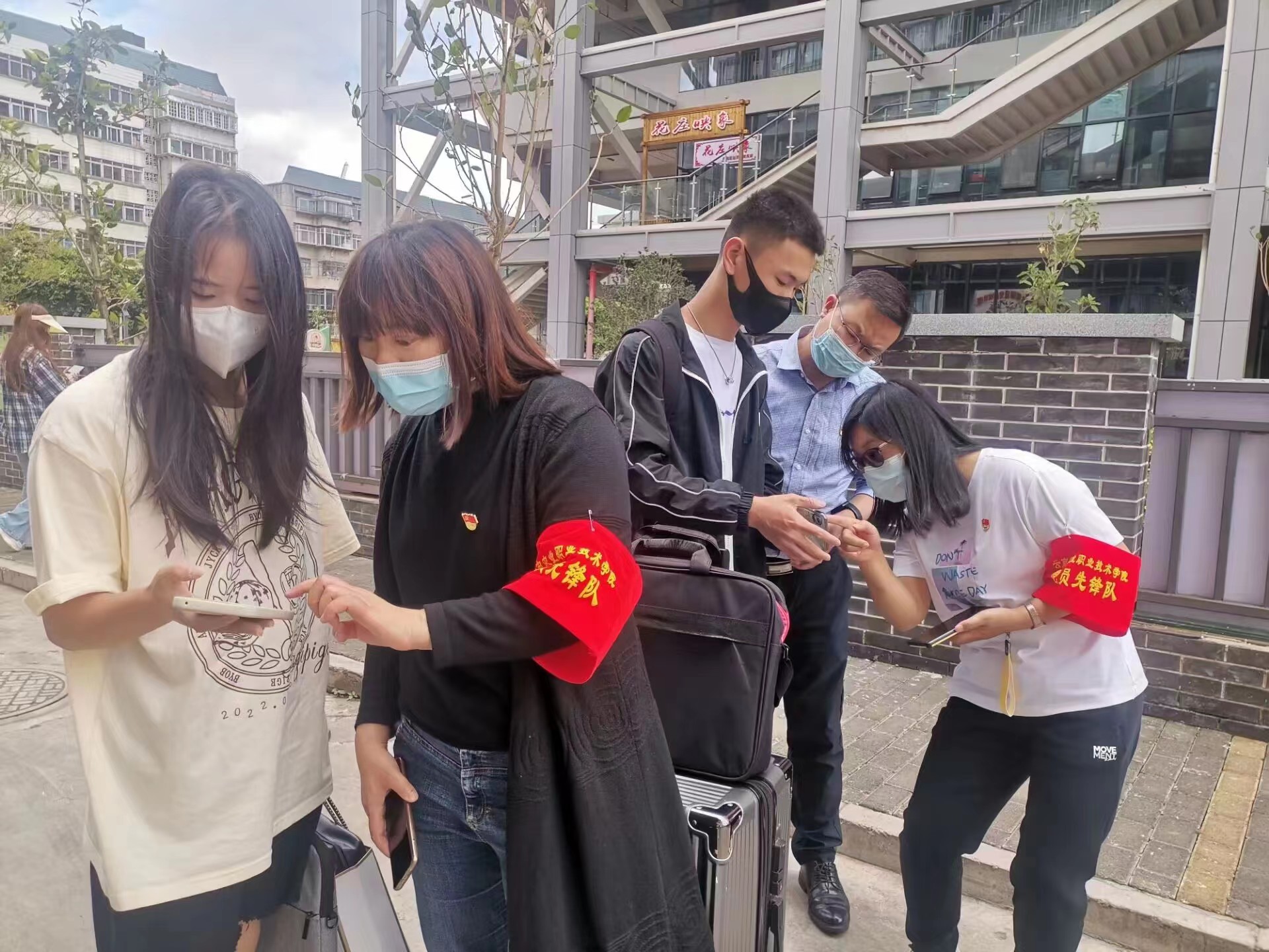 活动最后,结合互联网技术学院21级学生28日返校实际,在文俊同志的带领下,全体党员和入党积极分子参与了茭菱校区开学迎接学生工作,在校门口设置党员先锋岗,引导学生们按照疫情防控的要求进校,并查验返校学生健康码、行程码、48小时内的核酸检测报告以及进行李消杀,及时帮助学生解决突发问题和存在的实际困难等。