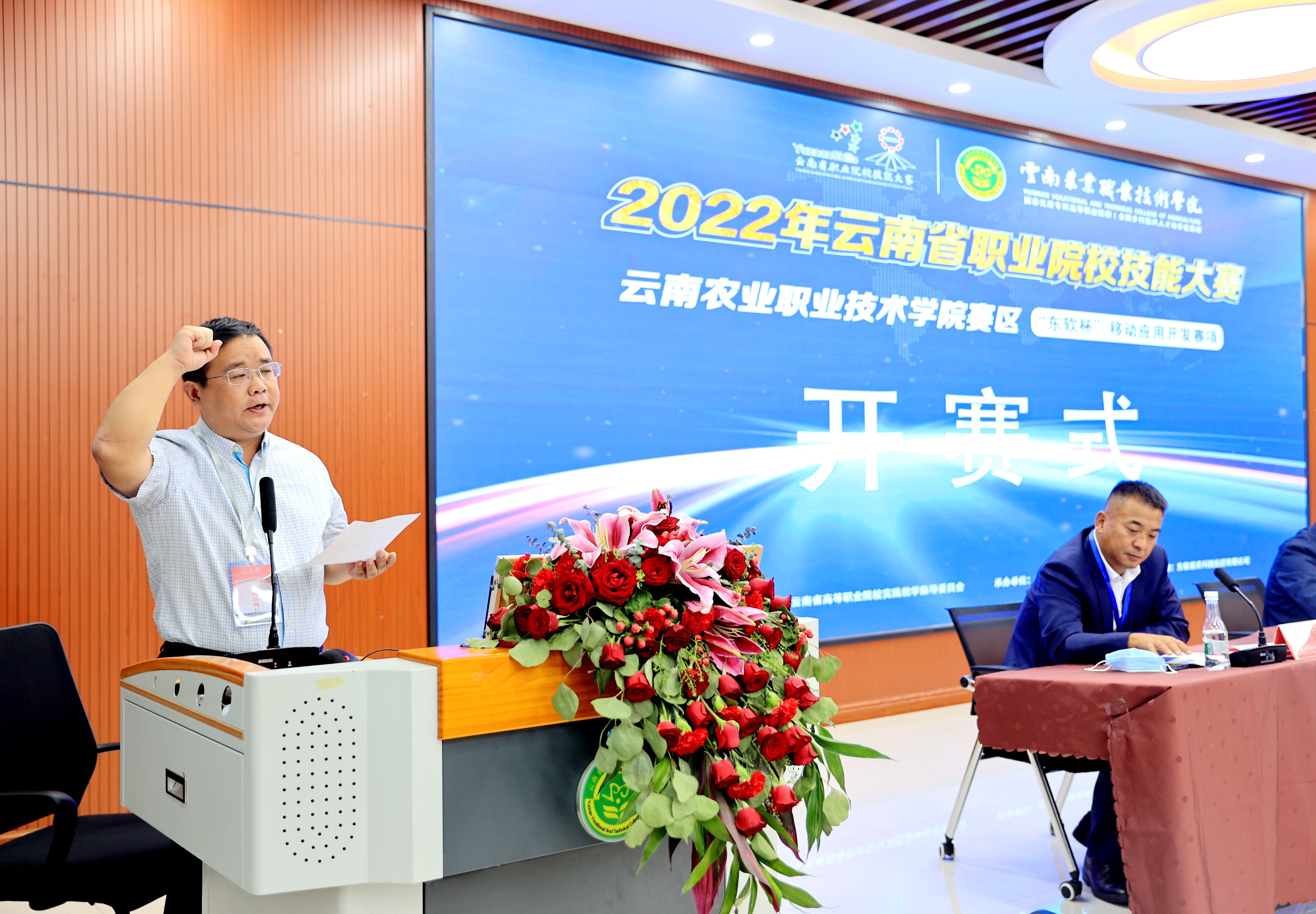 云南省教育厅职成教处刘其勇处长在开赛式上致辞。他指出,技能大赛在给相关院校师生搭建竞技平台的同时,也为各职业院校提供了难得的学习交流和展示教学成果的机会,希望各职业院校珍惜机会,认真学习借鉴兄弟职业院校的好经验和好做法,强化内涵发展,提升办学水平,希望同学们珍惜此次机会,认真备赛,赛出水平、赛出风格、赛出友谊、赛出进步!