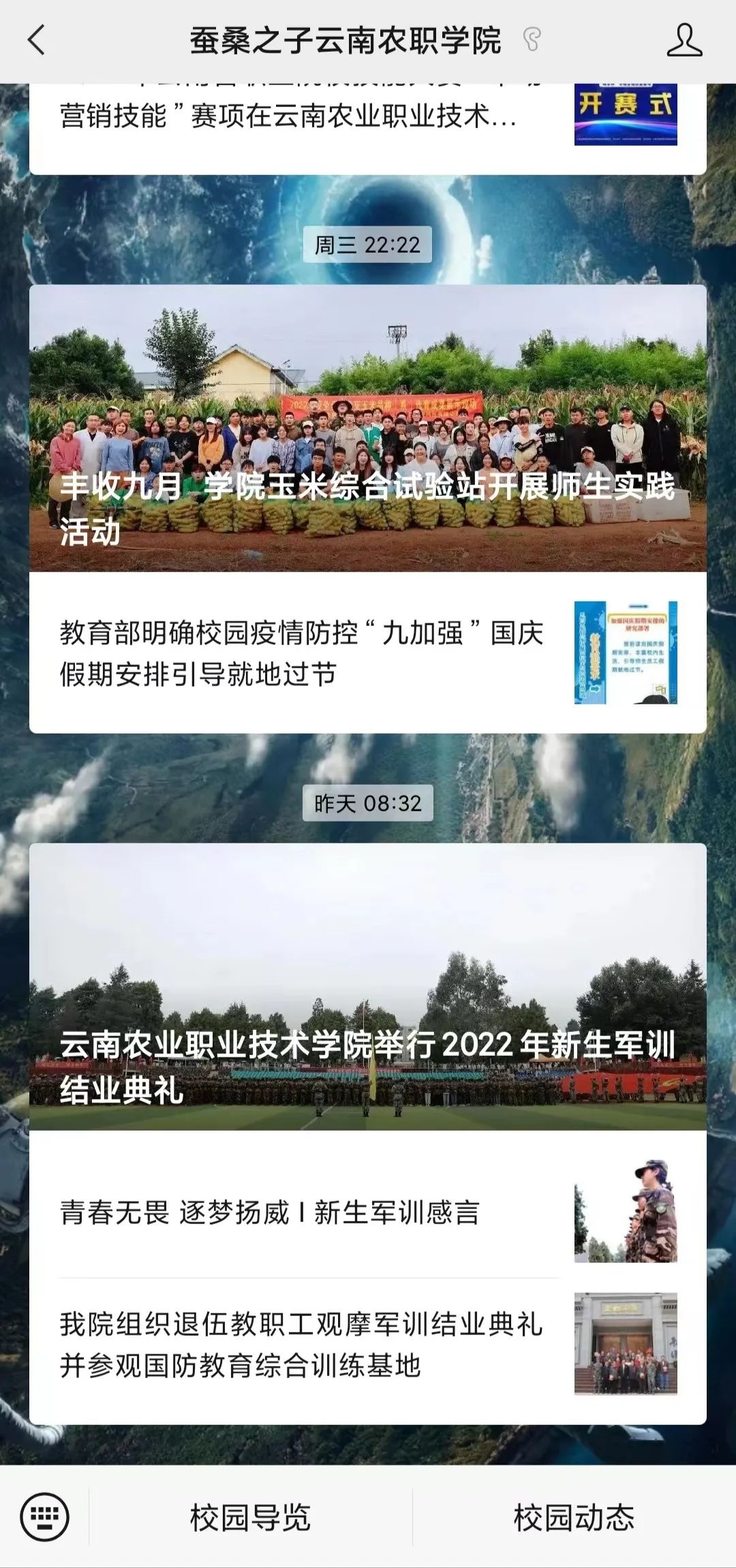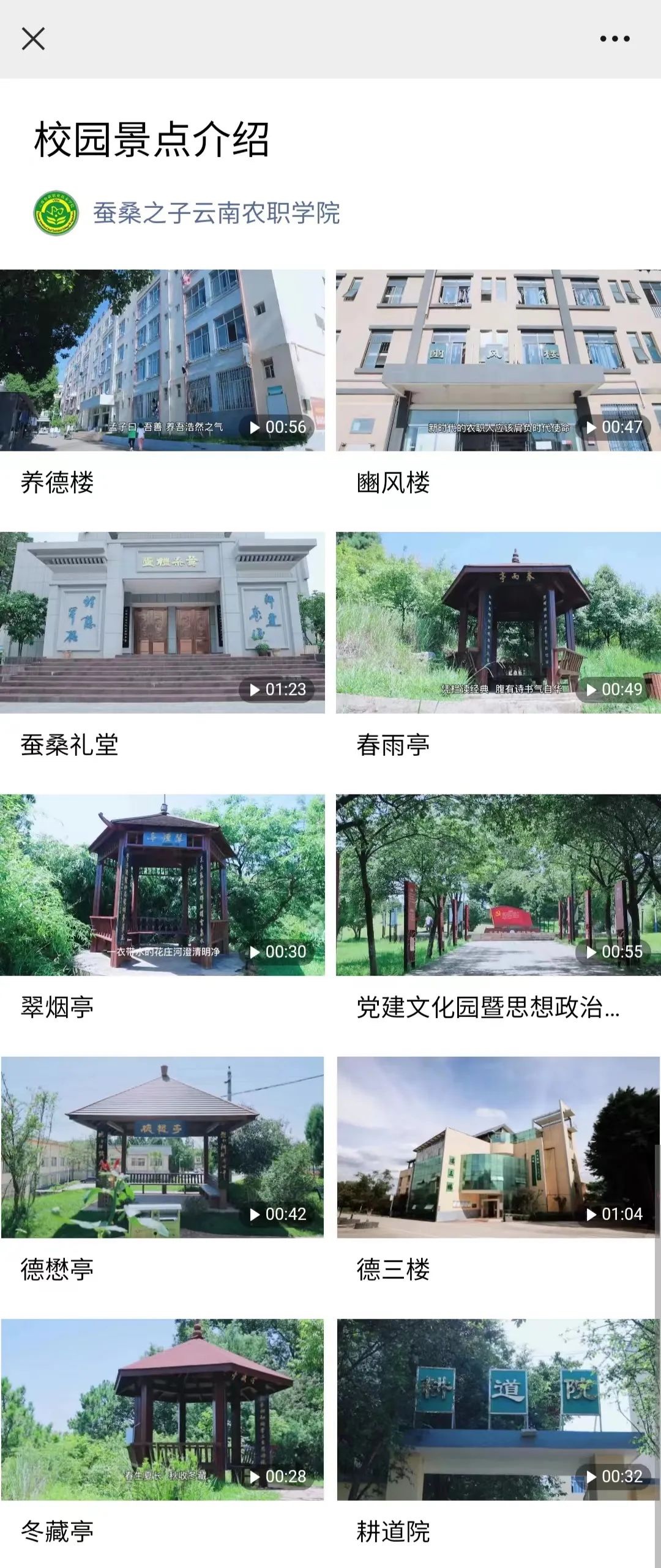 打开“蚕桑之子云南农职学院”,点击下属菜单“校园导览”,即可足不出户领略校园风光,品味学院的历史文化底蕴。