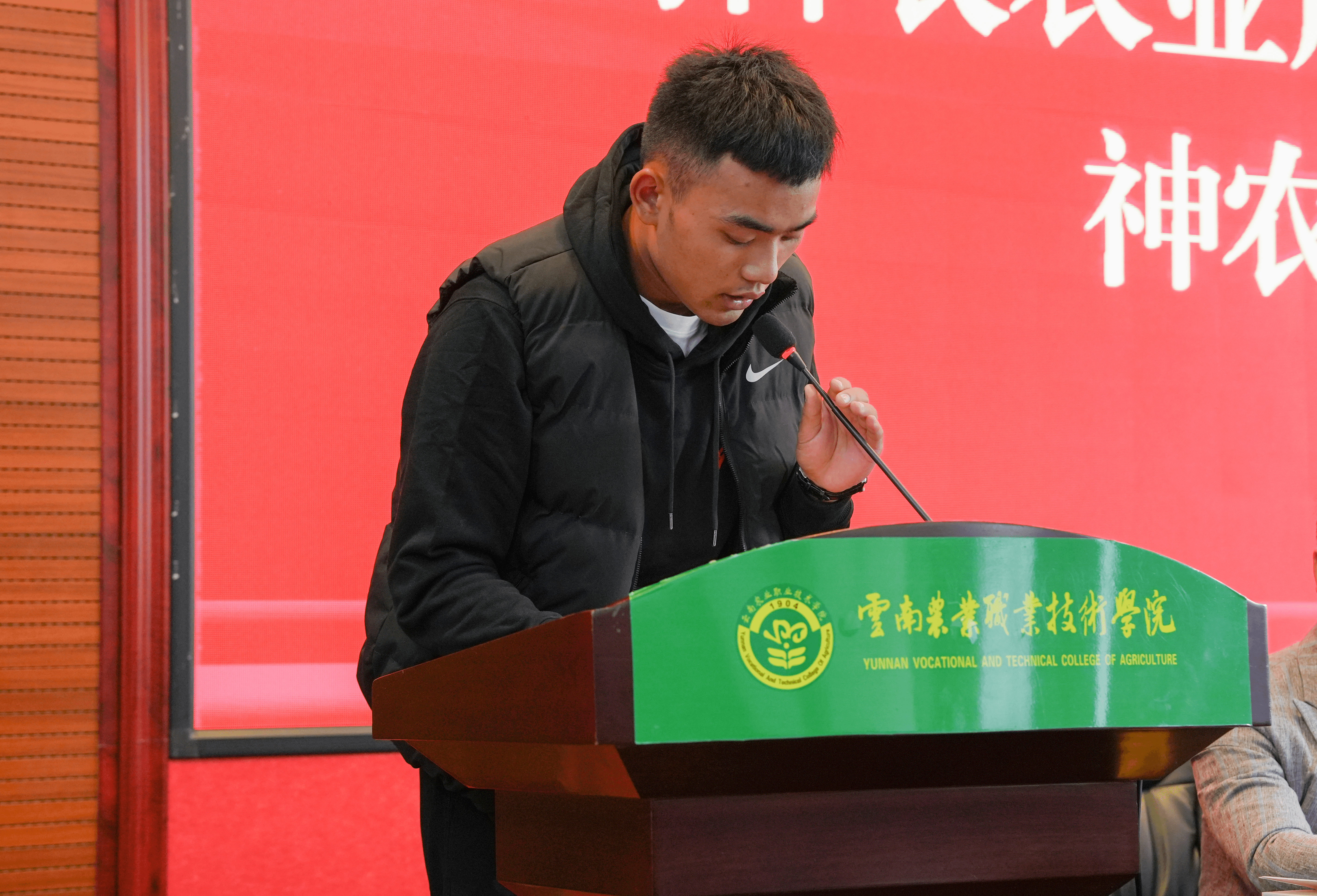 云南神农集团总裁助理兼人力资源中心总监何昕阳、养殖事业部兽医总监李明等一行;我院党委书记文俊、副院长苏华伟及畜牧兽医学院领导班子;“神农班”学生、畜牧兽医学院大一新生参加此次开班仪式。