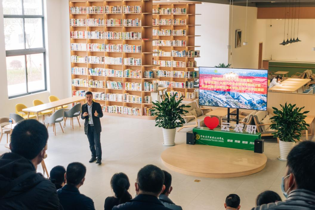 实地考察结束后,全体同志在图书馆开展交流座谈会,会议由徐红卫院长主持。会上,徐红卫院长详细介绍了云安产业学院办学情况及“42135”的综合管理模式。并交流了云安产业学院发展建设的愿景,一是始终坚持差异化战略,加快校园数字化管理进程,实现教育教学数字化建设;二是推动云安产业学院国际化发展,以昆明为枢纽,辐射东南亚;三是坚持产业化特色办学模式,瞄准市场设专业,满足产业链人才培养需求。