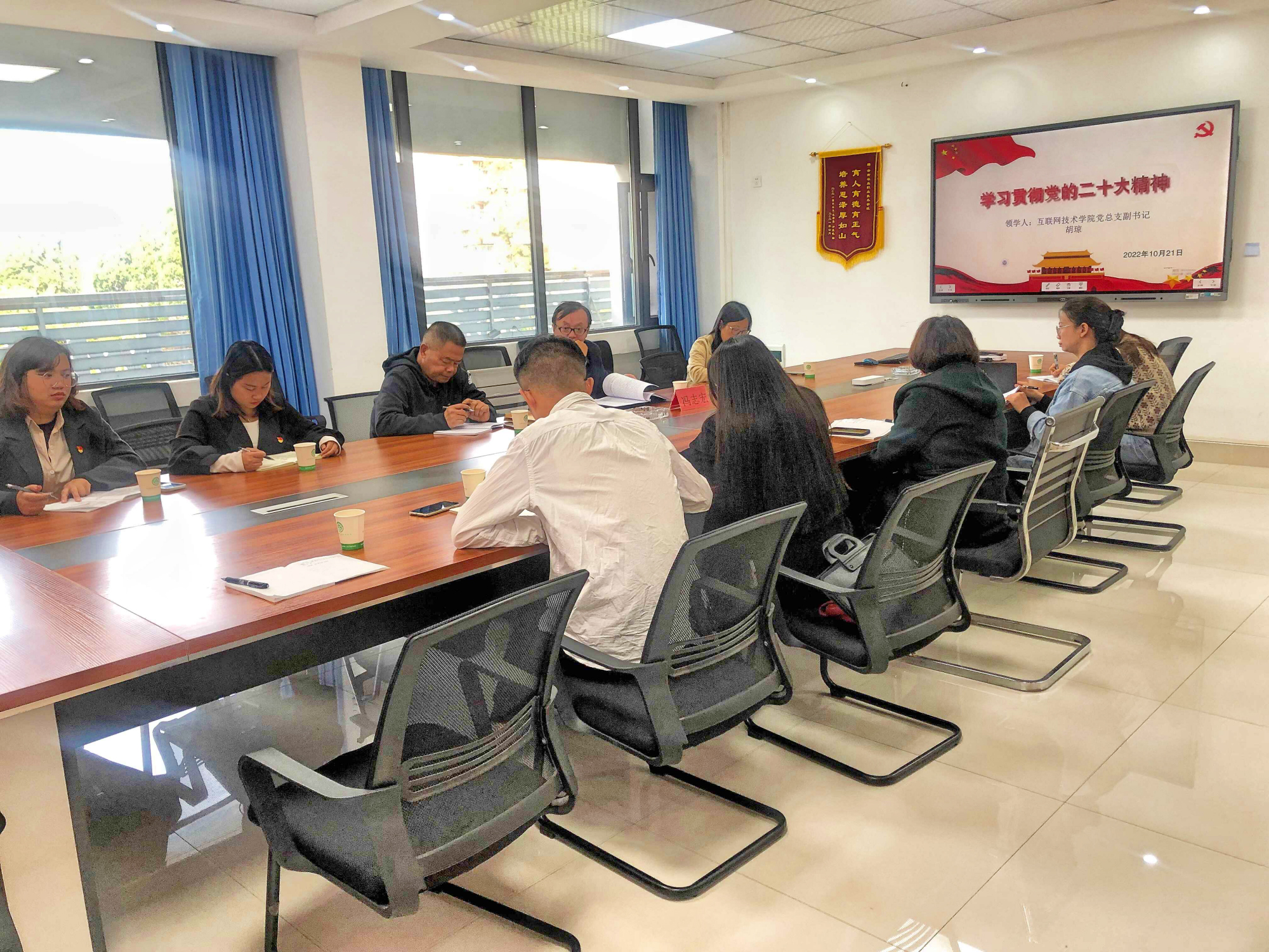10月21日上午,互联网技术学院党总支全体党员在教学楼202会议室举行集中学习,认真学习党的二十大报告,学校纪委书记冯志宏、离退休党总支书记凌军莅临指导。