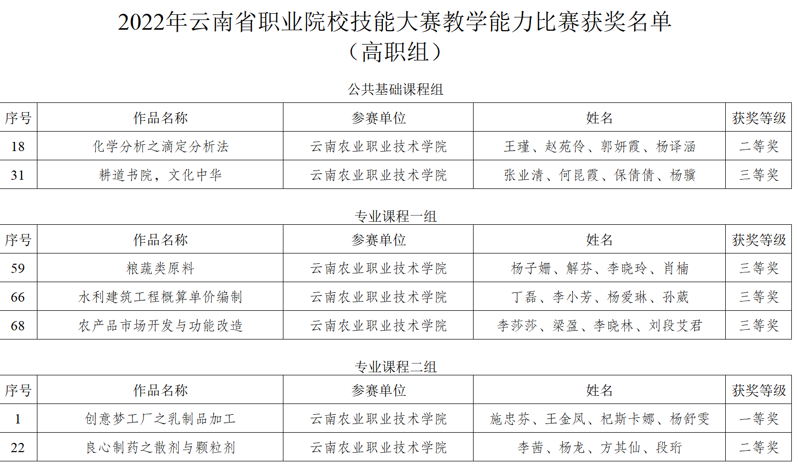 近日,云南省教育厅公布了2022年云南省职业院校技能大赛教学能力比赛的获奖名单,我院在高职组比赛中获得可喜成绩,其中,王瑾、赵苑伶、郭妍霞、杨译涵老师的作品“化学分析之滴定分析法”荣获公共基础课程组二等奖,张业清、何昆霞、保倩倩、杨骥老师的作品“耕道书院,文化中华”荣获公共基础课程组三等奖;杨子姗、解芬、李晓玲、肖楠老师的作品“粮蔬类原料”,丁磊、李小芳、杨爱琳、孙葳老师的作品“水利建筑工程概算单价编制”,李莎莎、梁盈、李晓林、刘段艾君老师的作品“农产品市场开发与功能改造”,均荣获专业课程一组三等奖;施忠芬、王金凤、杞斯卡娜、杨舒雯的作品“创意梦工厂之乳制品加工”荣获专业课程二组一等奖,李茜、杨龙、方其仙、段珩老师的作品“良心制药之散剂与颗粒剂”荣获专业课程二组二等奖。