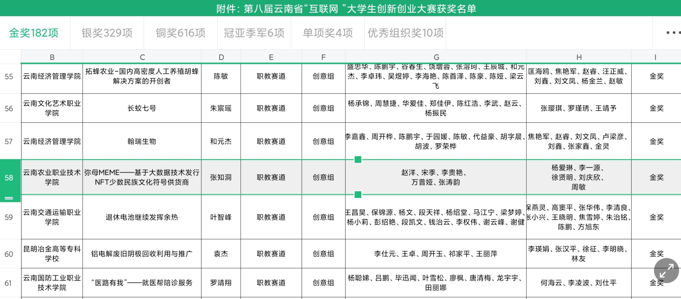 近日,云南省教育厅公布了第八届云南省“互联网+”大学生创新创业大赛的获奖名单。我院由杨爱琳老师负责,李一源、徐贤明、刘庆欣、周敏等老师指导,张知洞、赵洋、宋季、李贵艳、万普娅、张涛韵等同学的参赛作品“弥母MEME——基于大数据技术发行NFT少数民族文化符号供货商”,于教职通道创意组荣获金奖!