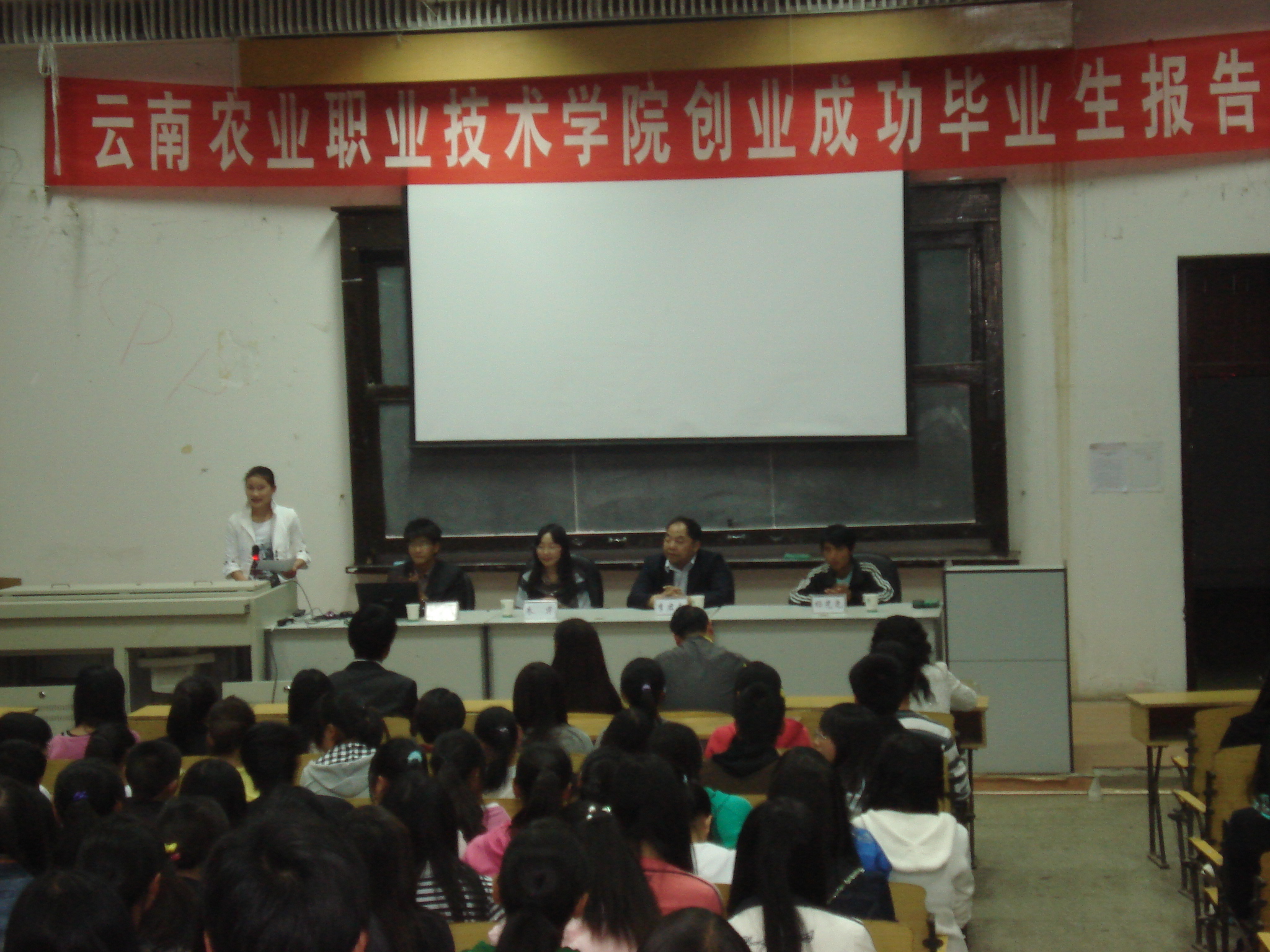 4月7日小哨校区的报告会在热烈的气氛中召开。我院2008届作物生产技术专业毕业生官之飞、2008届园林技术专业毕业生米军及2006届畜牧兽医专业毕业生杨梅分别为小哨校区同学做了精彩的经验交流。官之飞同学毕业工作两年后在宜良开办惠农农资销售经营部、米军于09年开办花卉租赁店,杨梅在毕业两年后在西山区开办了宠物门诊。目前,三位毕业生的经营状况很好,并且已经有了各自的稳定客户。他们以自己的亲身经历和对创业的真切感悟给了同学们很大的启发。并且与现场同学积极互动,为同学们答疑解惑。在创业动机,创业方向选择以及创业应具备的素质等方面给同学门进行有力的指导。而李军武导师的讲评也使整个报告会到达高潮。