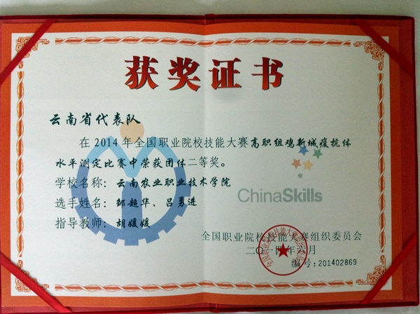 此前,畜牧兽医学院《鸡新城疫抗体水平测定》团队获得2014年云南省高职院校比赛第一名。该项目全国共有52个代表队参赛,设一等奖5个,二等奖10个,三等奖15个。