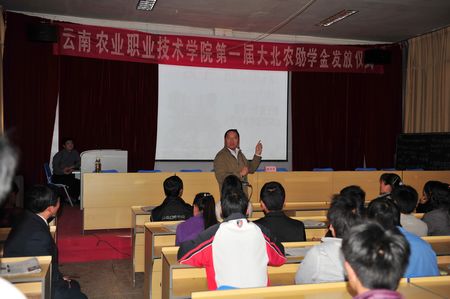 昆明大北农农牧科技有限公司经理岳宝在讲话中赞扬我院悠久而光荣的办学历史,赞扬学院为社会培养了大批优秀的学生;介绍了大北农企业的使命:“科教兴农,报国兴农”,帮助农民摆脱贫困,走向富裕,实现真正服务三农的宗旨。岳宝经理指出大北农集团在beat365在线唯一官网第一次发放助学金,今后要每年都发放,而且发放的基数还会不断增加。