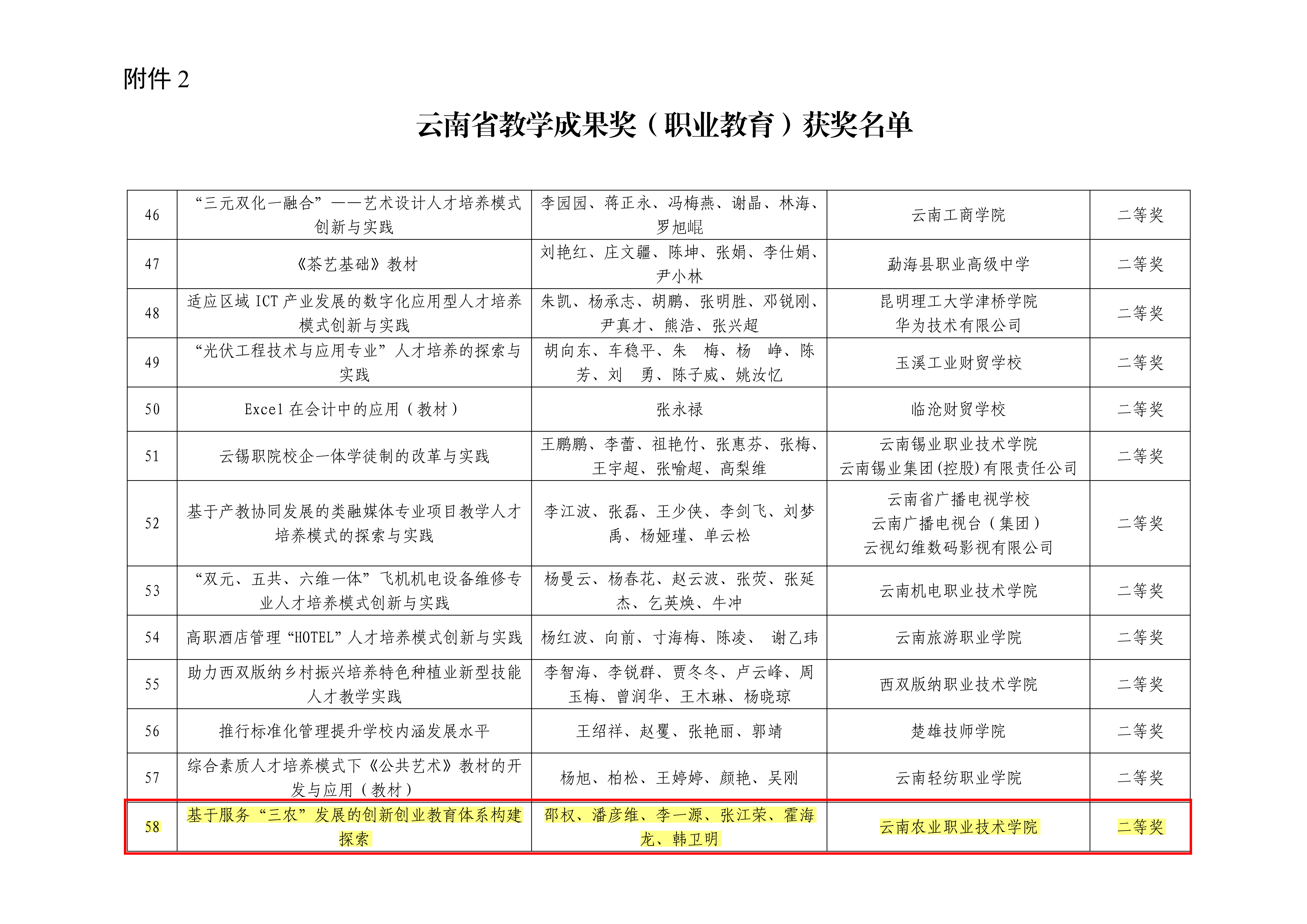 其中,我院申报的成果《全方位、全维度一体化的高质量育人体系构建探索》荣获云南省教学成果奖(职业教育)一等奖,申报成果《基于服“三农”发展的创新创业教育体系构建探索》荣获云南省教学成果奖(职业教育)二等奖。