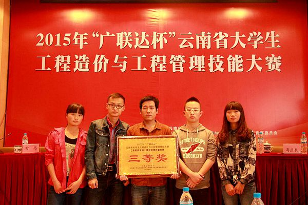 2015年“广联达杯”云南省大学生工程造价与工程管理技能大赛于4月17日至19日在昆明理工大学举行,来自全省28所院校的93支代表队分别参加工程造价技能、工程管理沙盘及招投标沙盘三项竞赛。工程学院派出刘亮、丁磊两位指导老师及刘玉翔、任思源、周渊等12名同学参赛,在众多参赛队伍中力克强队勇夺三等奖。