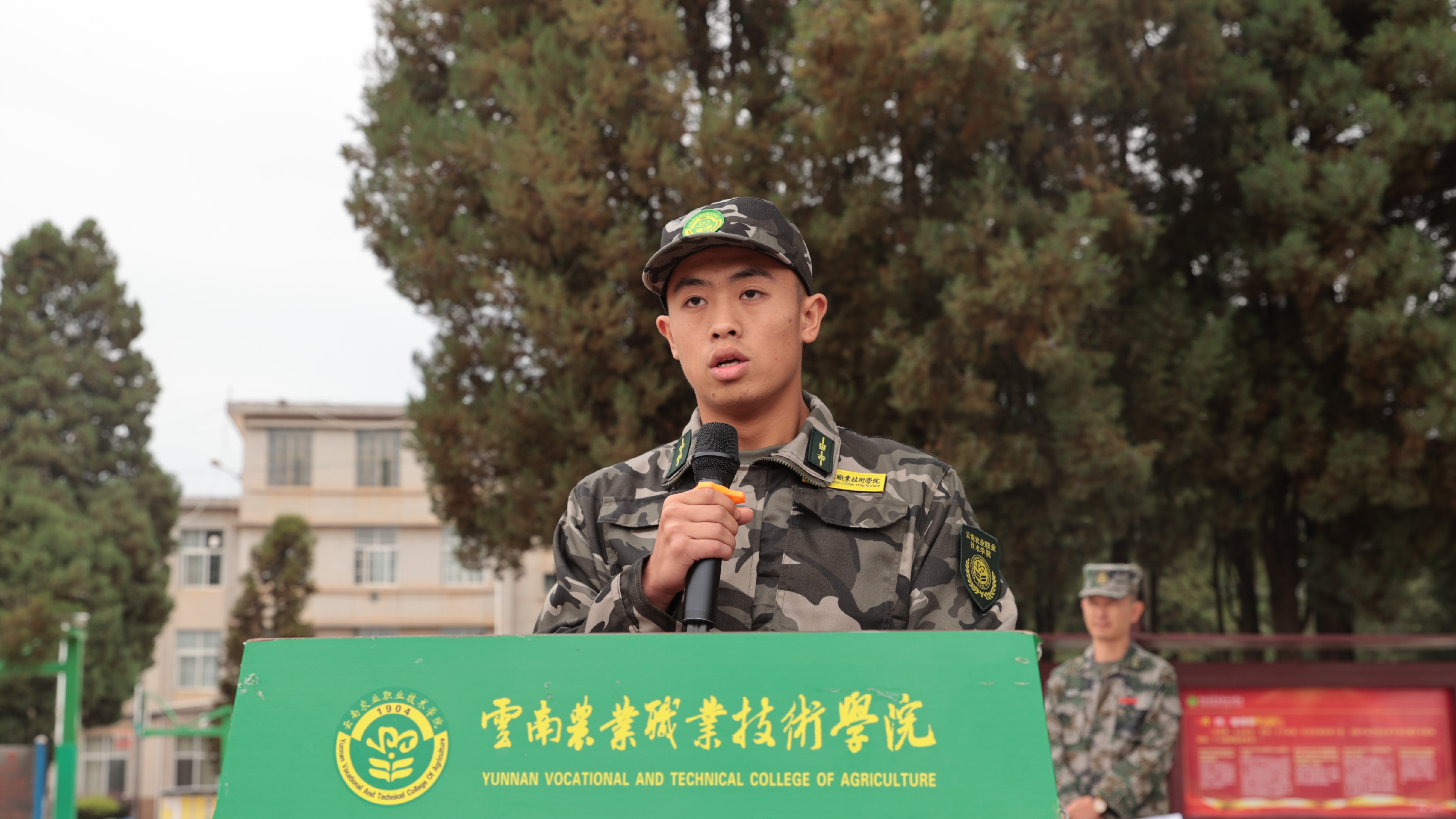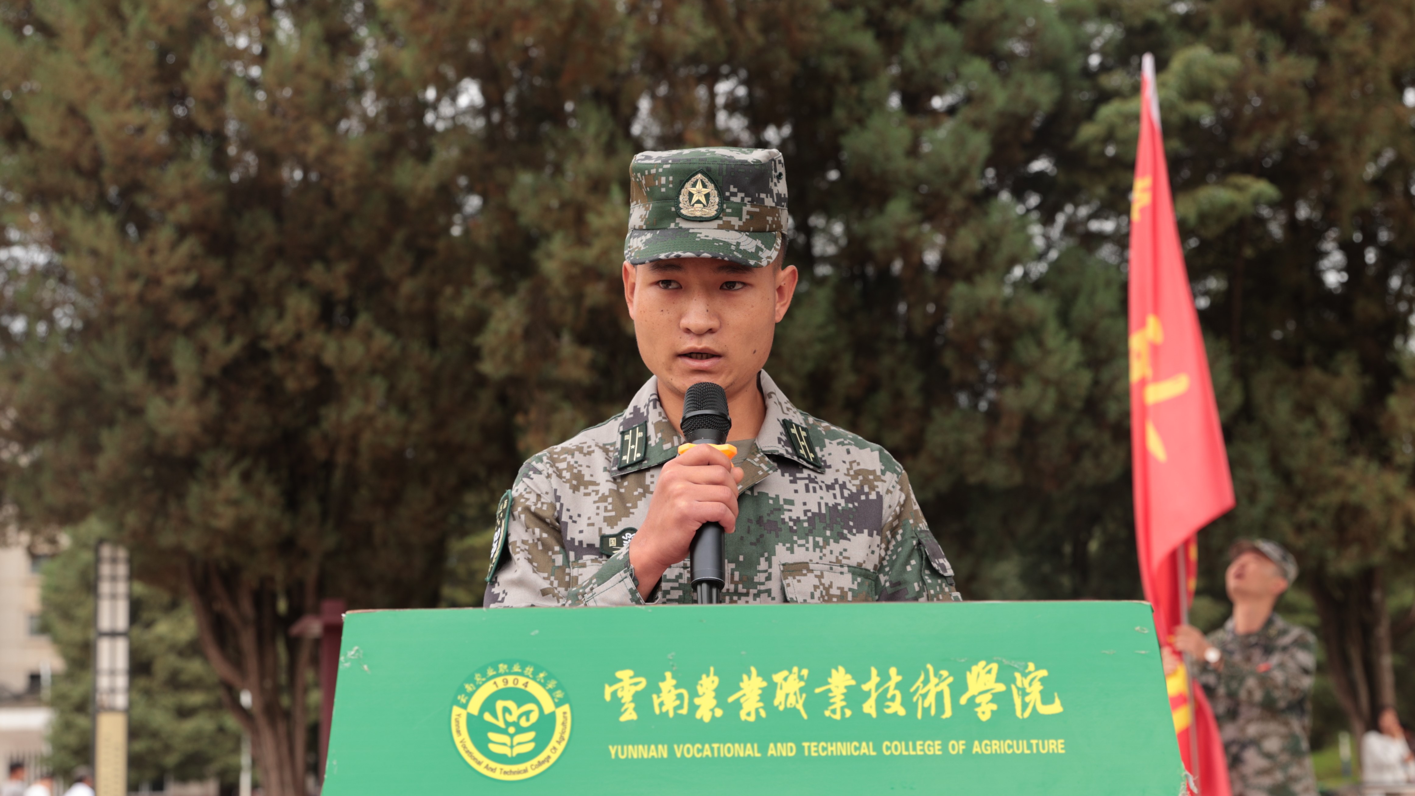 23级园艺技术二班的学生李响作为新生代表发言,他代表全体新生向教官、老师致以崇高的敬意和衷心的感谢。并代表新生庄严承诺,要严格要求,遵章守纪,以坚韧不拔的毅力,圆满完成军训任务,坚定理想做强国追梦人。
