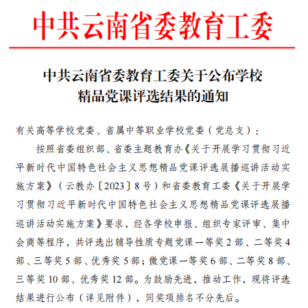 通知中心近日,中共云南省委教育工委公布学校学习贯彻习近平新时代中国特色社会主义思想精品党课评选结果,beat365官网马克思主义学院龙臻老师的微党课《“两个行”与“两个结合”》荣获三等奖。