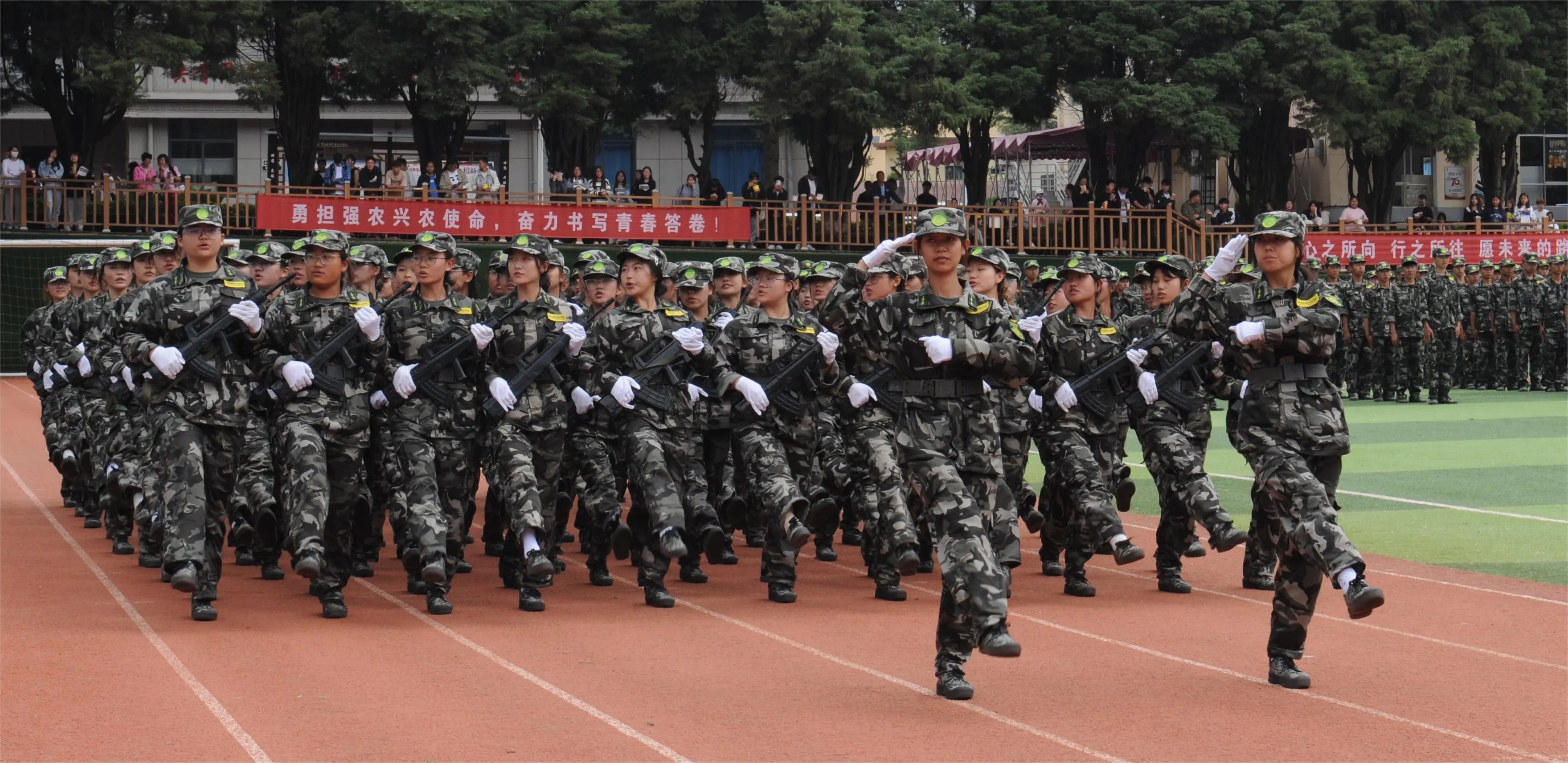 文俊书记检阅方队结束后回到观礼台,随后标兵队就位。2023级新生齐步、正步、跑步,各方队踏着整齐的步伐,依次前进走过主席台。同学们昂首挺胸,阔步前行,喊着嘹亮的口号,展现出了激情昂扬的精神风貌,这便是半月军旅生活在他们身上所磨砺出来的军人品质。