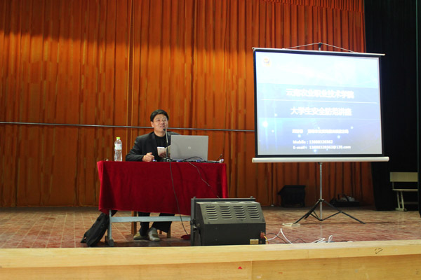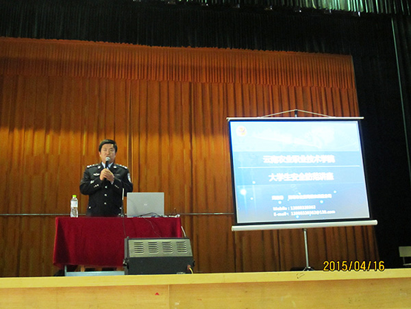 2015年4月16日中午13:00,工程学院和畜牧兽医学院在小哨校区大礼堂共同举办“大学生安全防范讲座”。本次讲座邀请了昆明市公安局便衣侦查分局政治处主任周迎春为同学们介绍大学生群体中容易遇到的各类案件以及相关的安全防范要点。畜牧兽医学院党总支书记钱林东、工程学院院长李一源等出席聆听了讲座。讲座由工程学院党总支书记蔡永生主持。