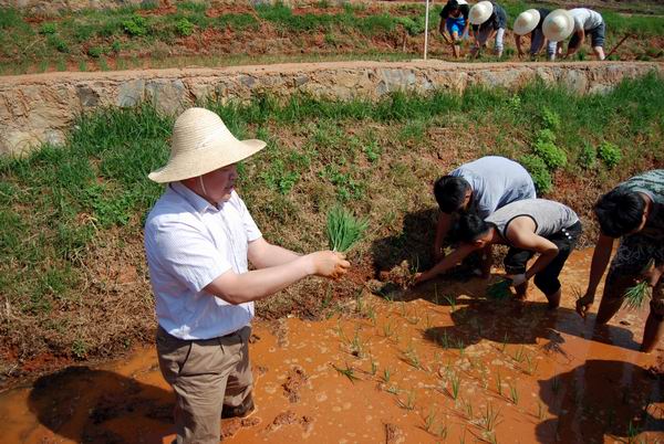 唐世凯教授向全体师生对水稻种植所涉及的土地平整、水分控制、施肥量、肥料比例、株行距、拔秧插秧、补苗等各个环节技术要点做了全面讲解示范;同时,还将132名同学分组并分别进行指导。唐教授不仅纠正了同学们不规范的技术手法,而且激发了同学们的干劲。同学们严格按照技术要求纷纷踊跃下到田间开始动手实践,稻田充满了同学们的欢笑声,洋溢着青春的活力。