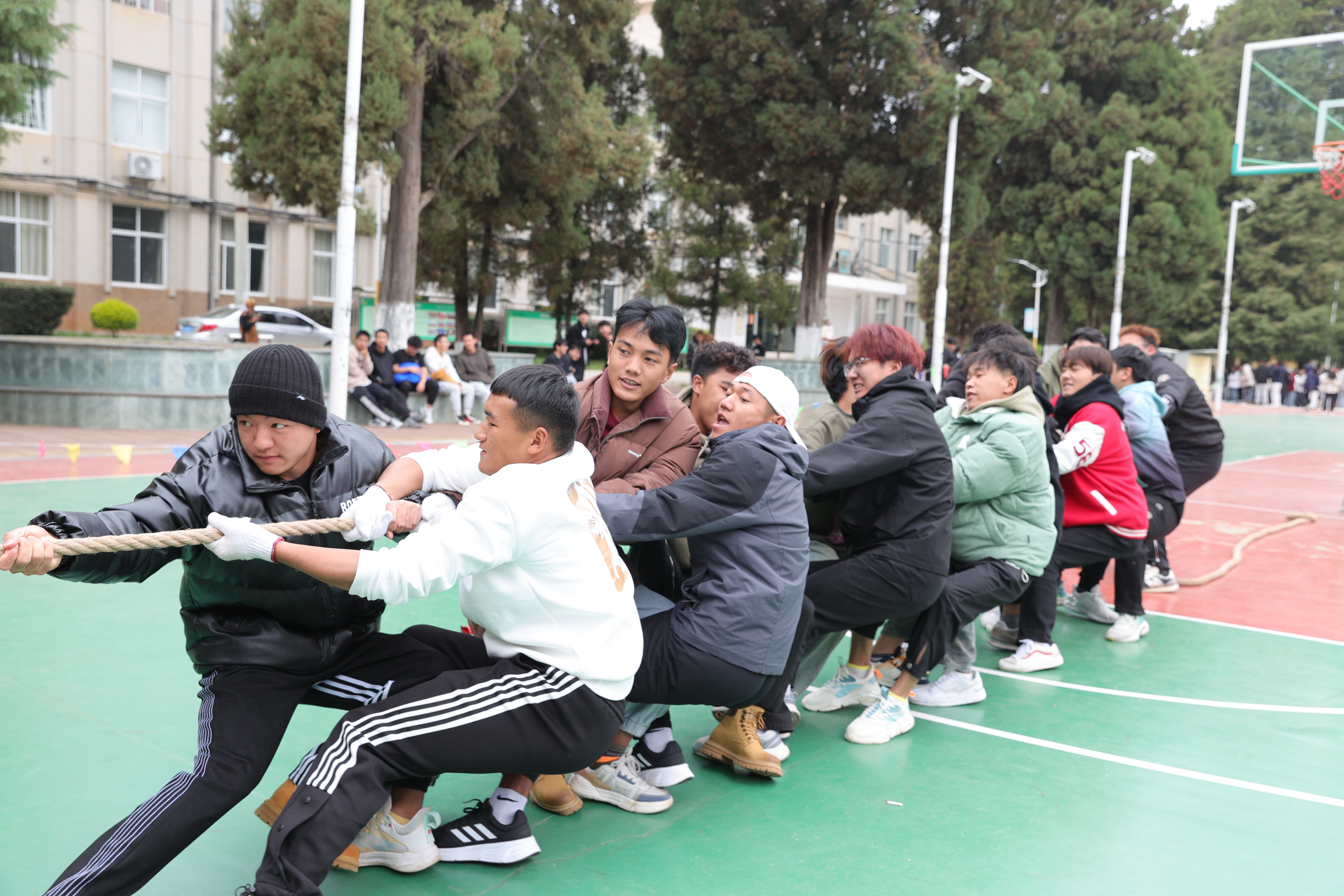 这是力量与团队精神的最佳展示!双方队伍全力以赴,紧握绳索,用尽全力向后拉。每一次的拉扯,都是对胜利的渴望和对挑战的坚持。汗水、呼吸、力量,都在这一刻凝聚,形成了一幅动人的画面。