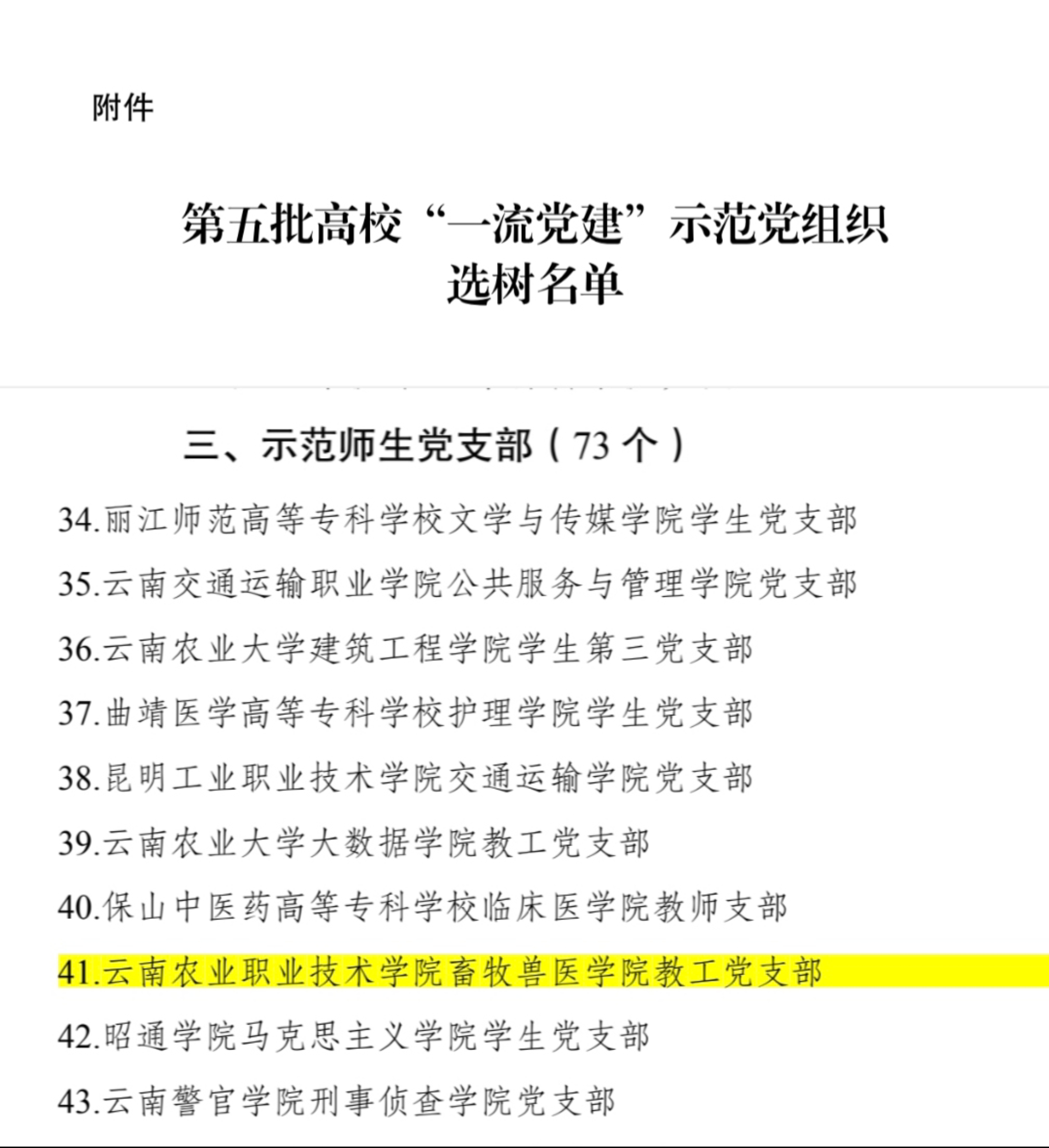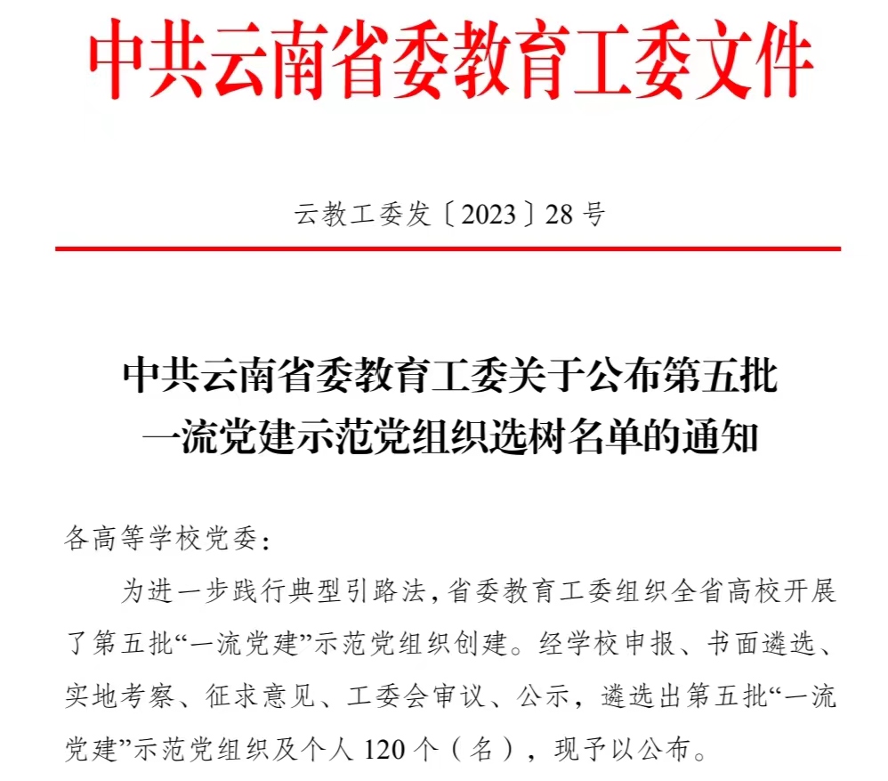 通知中心近日,中共云南省委教育工委公布第五批“一流党建”示范党组织及个人选树名单。为进一步践行典型引路法,省委教育工委组织全省高校开展了第五批“一流党建”示范党组织创建。经学校申报、书面遴选、实地考察、征求意见、工委会审议、公示,遴选出第五批“一流党建”示范党组织及个人120个(名)。我院畜牧兽医学院教工党支部被省委教育工委选树为第五批示范师生党支部。