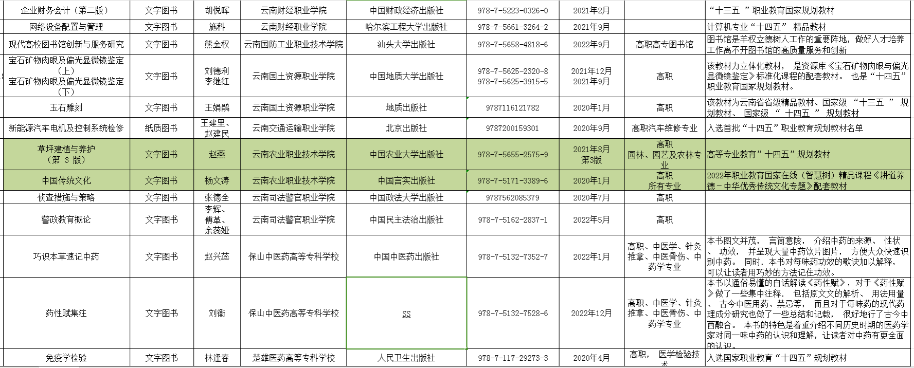 高等职业教育规划教材《草坪建植与养护》自2007年8月首次由中国农业大学出版社出版发行以来,一直坚持为育人服务,被评为二00九年云南省高校优秀教材,同时编著者不断精进,关注行业发展动态、技术更新;2012年出版了第2版,2021年出版了第3版;该教材突出的实用性和可操作性,非常受用书者欢迎。创新性素质教育精品教材《中国传统文化》2020年1月由中国言实出版社出版发行,是2022年国家职业教育精品在线课程耕道养德—中华优秀传统文化专题的配套教材,由学院中华优秀传统文化课程组编写。该教材以“立德树人、铸魂育人”为中心,融合了中华优秀传统文化核心思想,农耕文化与耕读教育,云南民族文化与铸牢中华民族共同体意识,赓续学校精神、创新创建文化校园,实现文化素质教育价值引领作用的特色校本教材。