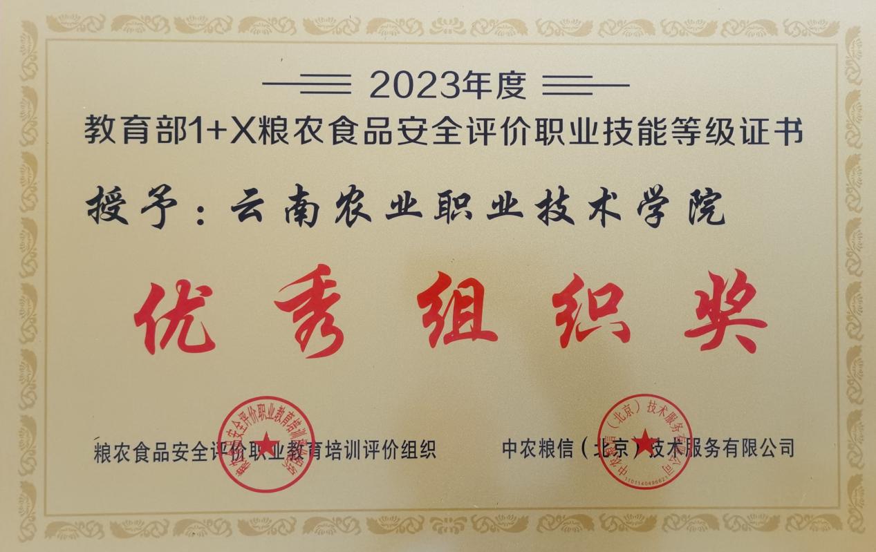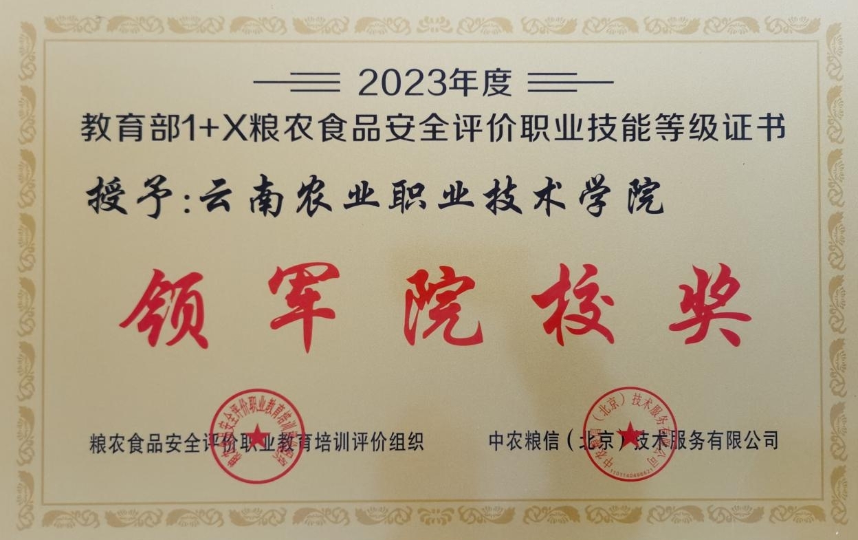 通知中心根据教育部1+X粮农食品安全评价职业教育培训评价组织文件《关于2023年度1+X粮农食品安全评价职业技能等级证书试点工作优秀院校评选结果的公告》(中农粮信[2023]8号),学院荣获“领军院校奖”和“优秀组织奖”。