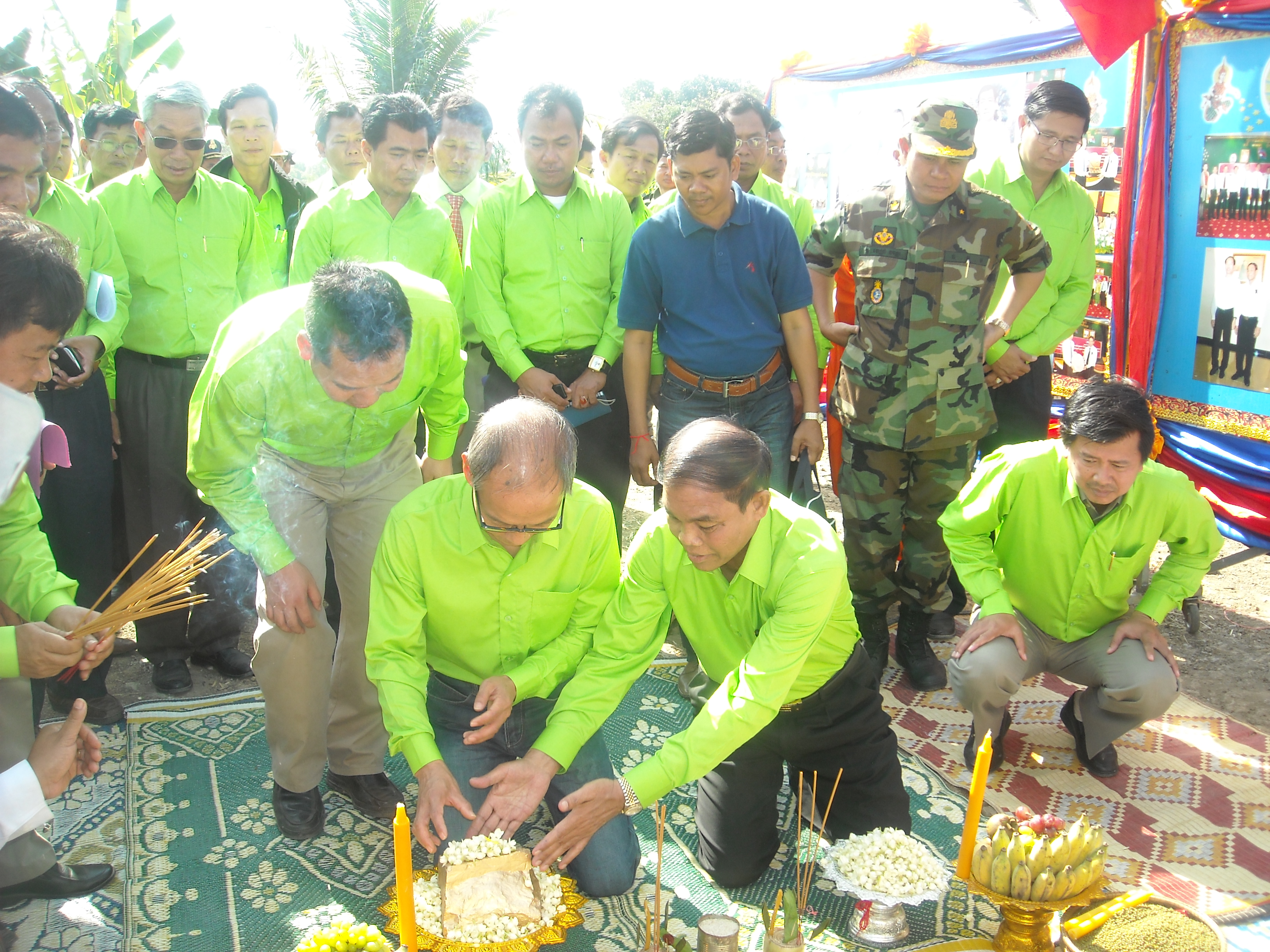 开工仪式后,按照柬埔寨王国的传统举行了奠基仪式,由翁恩省长与杨东云处长共同将奠基石抛入奠基坑,并向坑中撒入象征吉祥的茉莉花和象征丰收的稻谷、玉米、大豆、绿豆、花生等种子。“示范园”开工及奠基仪式的顺利举行,标志着该项目的实施已进入实质性的阶段,为项目的建设和后期运行奠定良好基