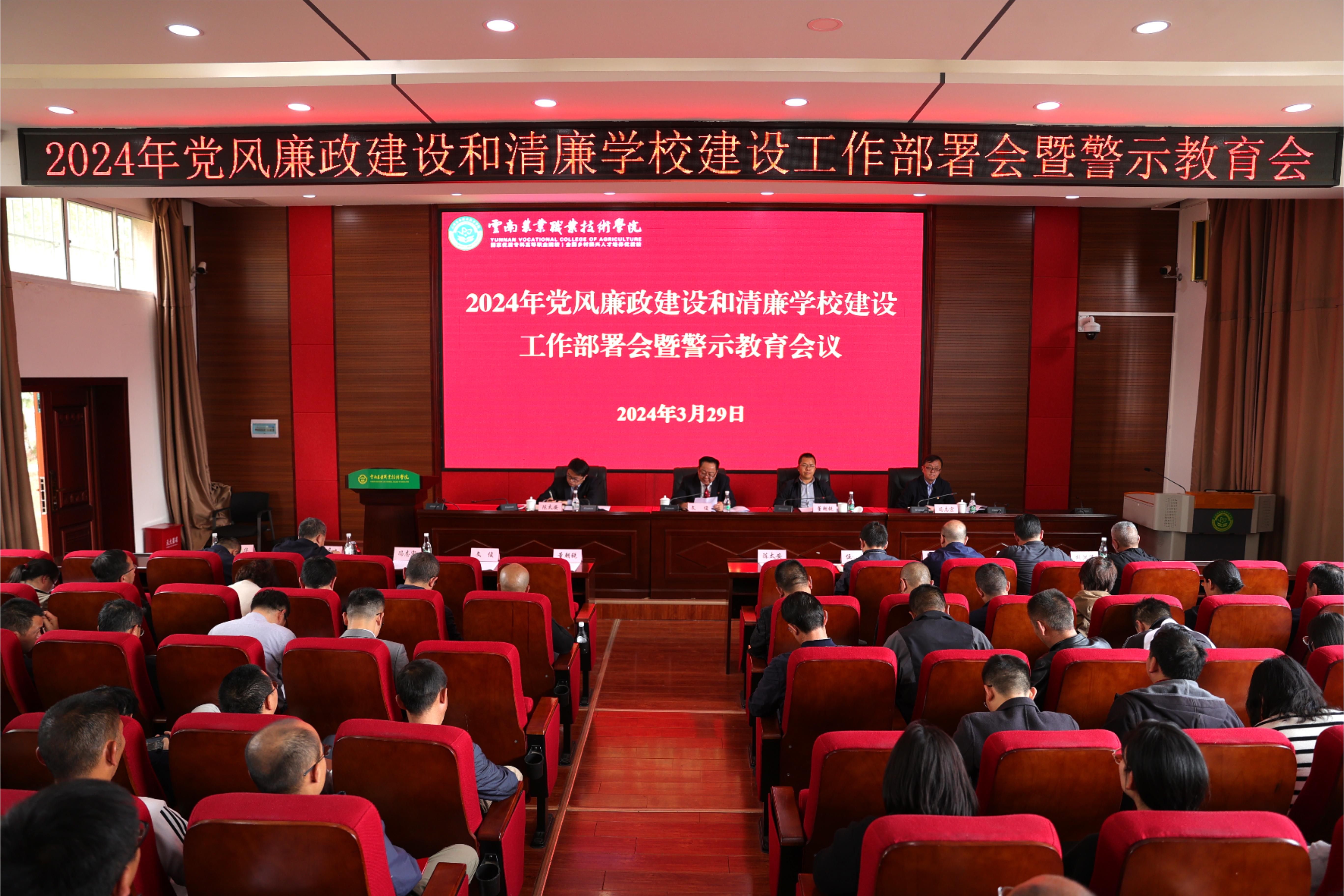 会议要求,2024年是学院实现“十四五”规划目标任务的关键一年,是实施高质量发展三年行动计划承上启下之年,学院第四次党代会即将召开,还将迎来办学120周年,既是里程碑也是新起点,责任重大、任务艰巨、使命光荣。学院各基层党组织要坚决执行中央和省委决策部署,认真贯彻落实二十届中央纪委三次全会和省纪委十一届四次全会、纵深推进清廉云南建设暨全省正风肃纪警示大会、全省教育系统党风廉政建设和清廉学校建设工作部署会暨警示教育会议精神,凝心铸魂,深化拓展主题教育成果;层层压实责任,扎实推进全面从严治党;坚持久久为功,打好作风建设持久战;注重多措“廉”动,以伟大自我革命精神,纵深推进“清廉农职”建设,为学院高质量发展营造清朗政治环境,确保高质量发展出成果、见实效。