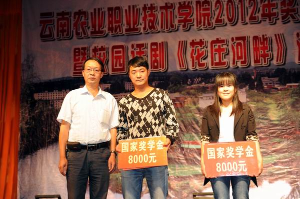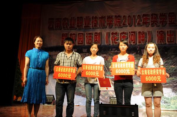 俞浩副院长为荣获国家奖学金的同学颁奖,每人八千元;赵莉副院长为荣获云南省政府奖学金的同学颁奖,每人六千元;党院办主任金吉斌、学生工作处处长周诚为荣获国家励志奖学金的同学颁奖,每人五千元;生物工程系党总支书记许邦丽、园艺与园林工程系党总支书记董文红、畜牧兽医系党总支书记钱林东为荣获云南省政府励志奖学金的同学颁奖,每人四千元;学生工作处副处长施碧强、生物工程系党总支副书记李一源、管理与信息工程系党总支副书记徐开宏为荣获学院奖学金的同学颁奖,每人一千元。