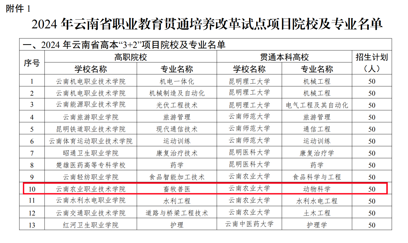 通知中心根据《云南省教育厅关于启动实施2024年职业教育贯通培养改革试点工作的通知》,我院“3+2”贯通培养项目获批,将与云南农业大学开展联合培养。“3+2”贯通培养项目学生在我院完成畜牧兽医专业专科学习,直接进入云南农业大学动物科学专业继续学习2年,毕业后获得全日制统招本科毕业证书和学位证书,第一学历为本科。