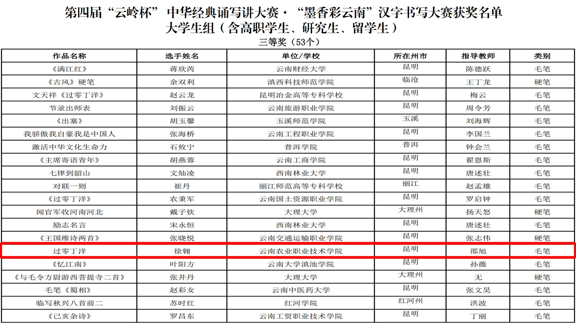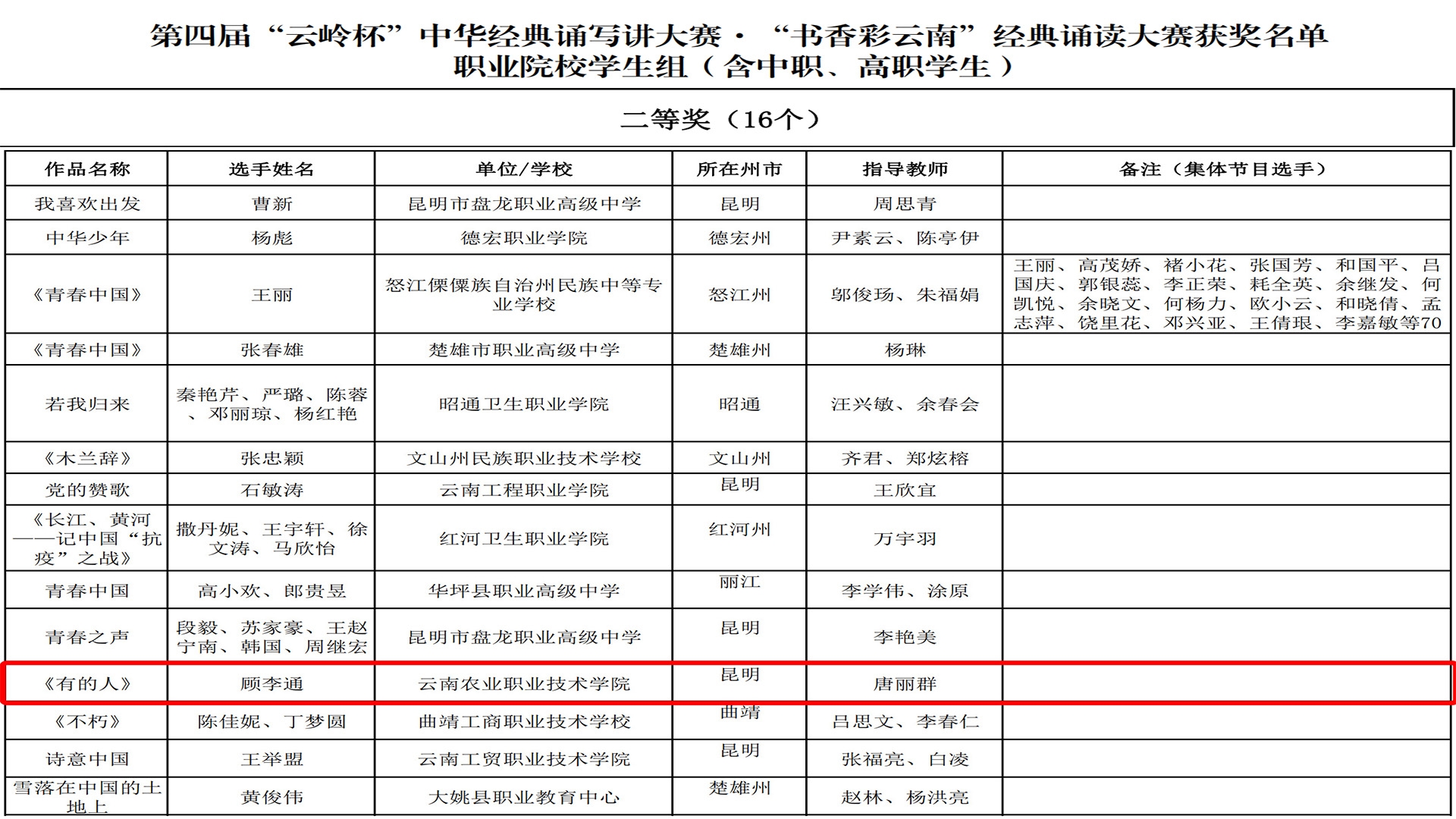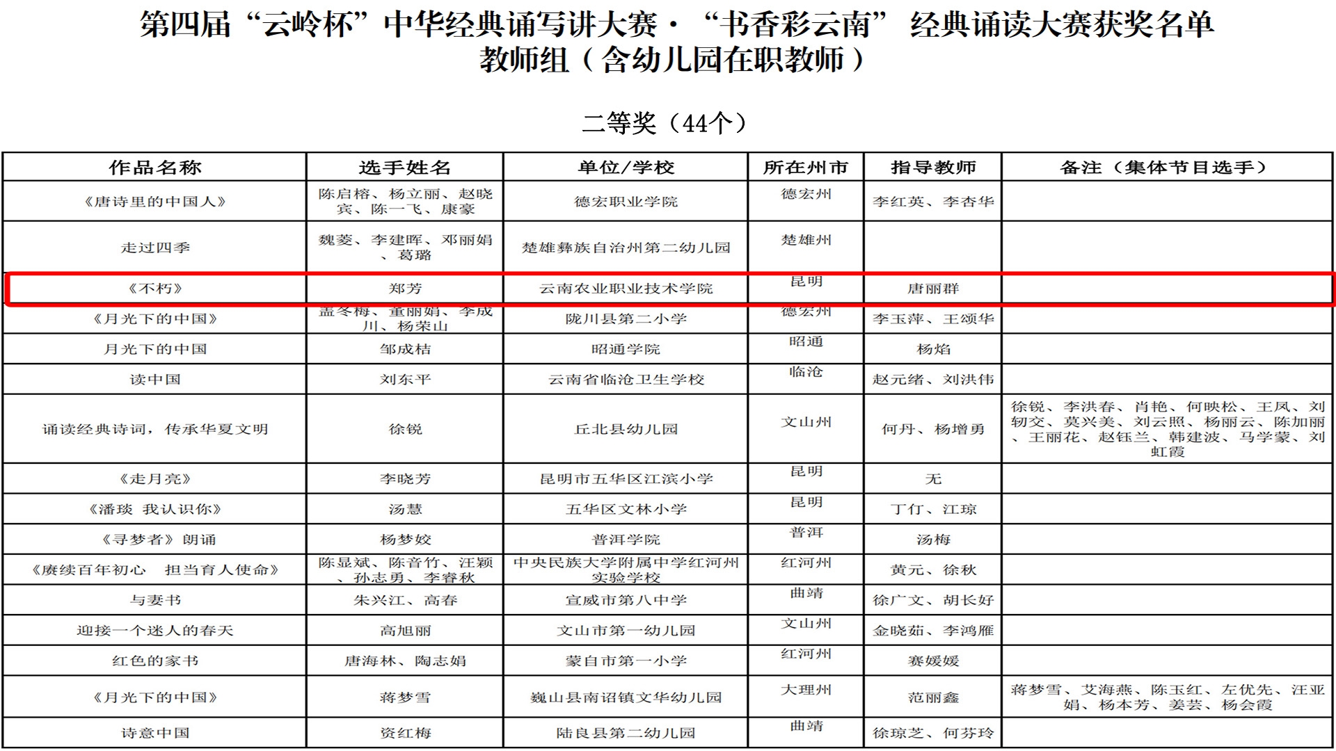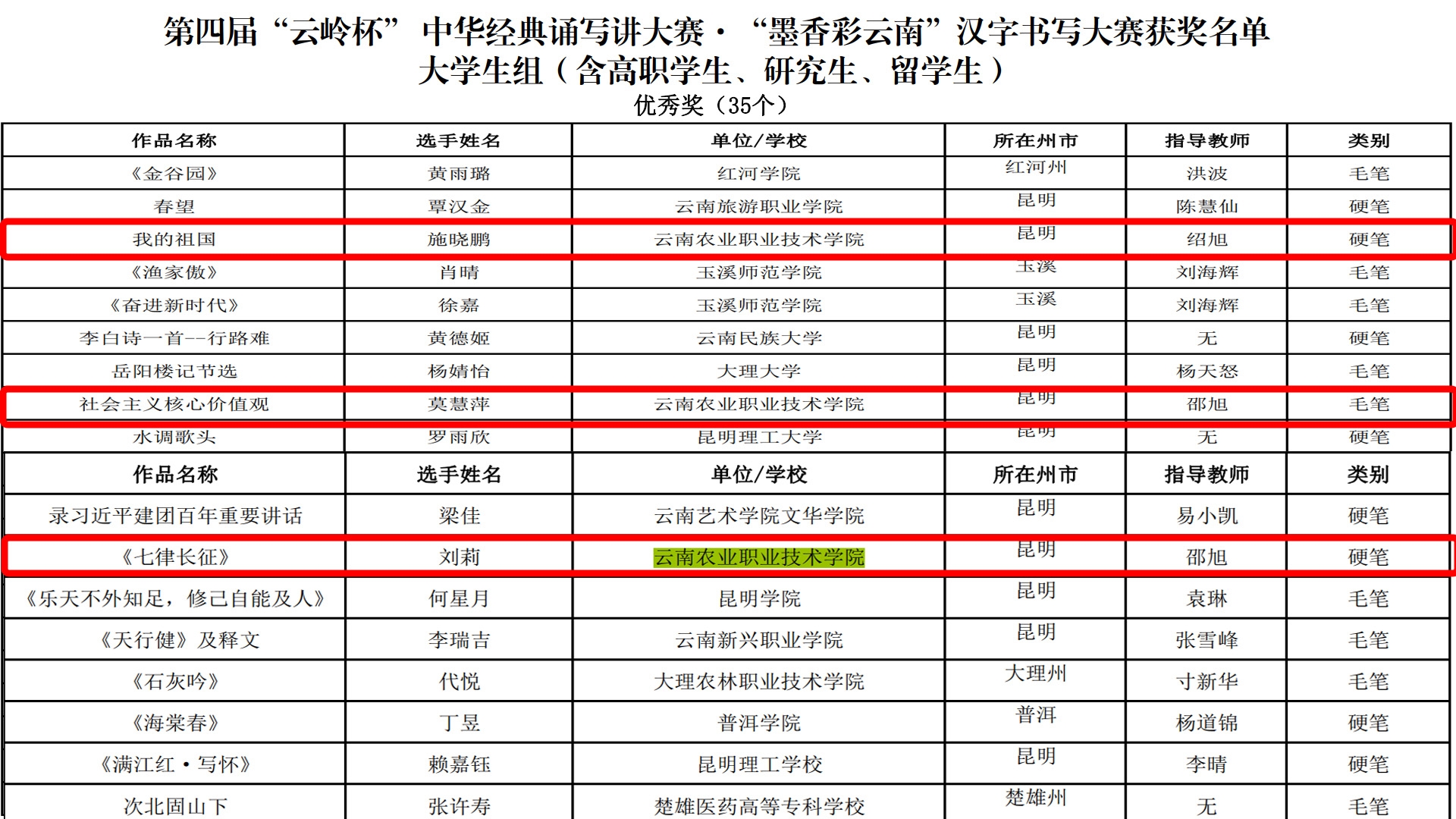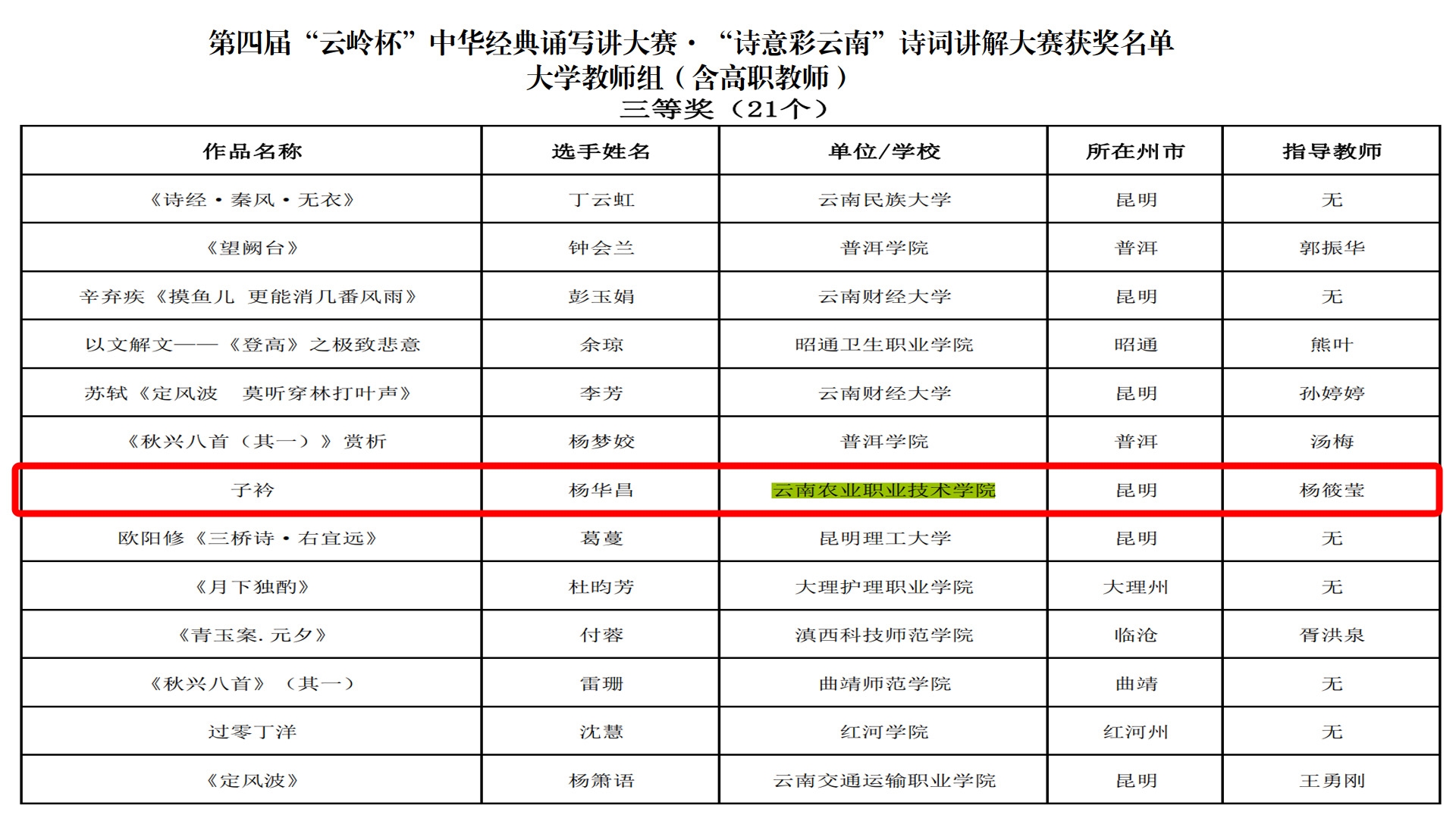 近日,省教育厅、省语委举办的第“云岭杯”中华经典诵写讲大赛系列活动公布了获奖名单我院师生在多个项目中获奖郑芳老师的作品《不朽》获经典诵读大赛教师组二等奖;杨华昌老师的作品《子衿》诗词讲解大赛教师组等奖;李芸欣老师的作品永遇乐(落日熔金)诗词讲解大赛教师组优秀奖。顾李通同学的作品《有的人》获经典诵读大赛大学生组二等奖;徐翱同学的作品《过零丁洋》获汉字书写大赛大学生组三等奖;施晓鹏同学的作品《我的祖国》、莫慧萍同学的作品《社会主义核心价值观》、刘莉同学的作品《七律长征》获汉字书写大赛大学生组优秀奖。
