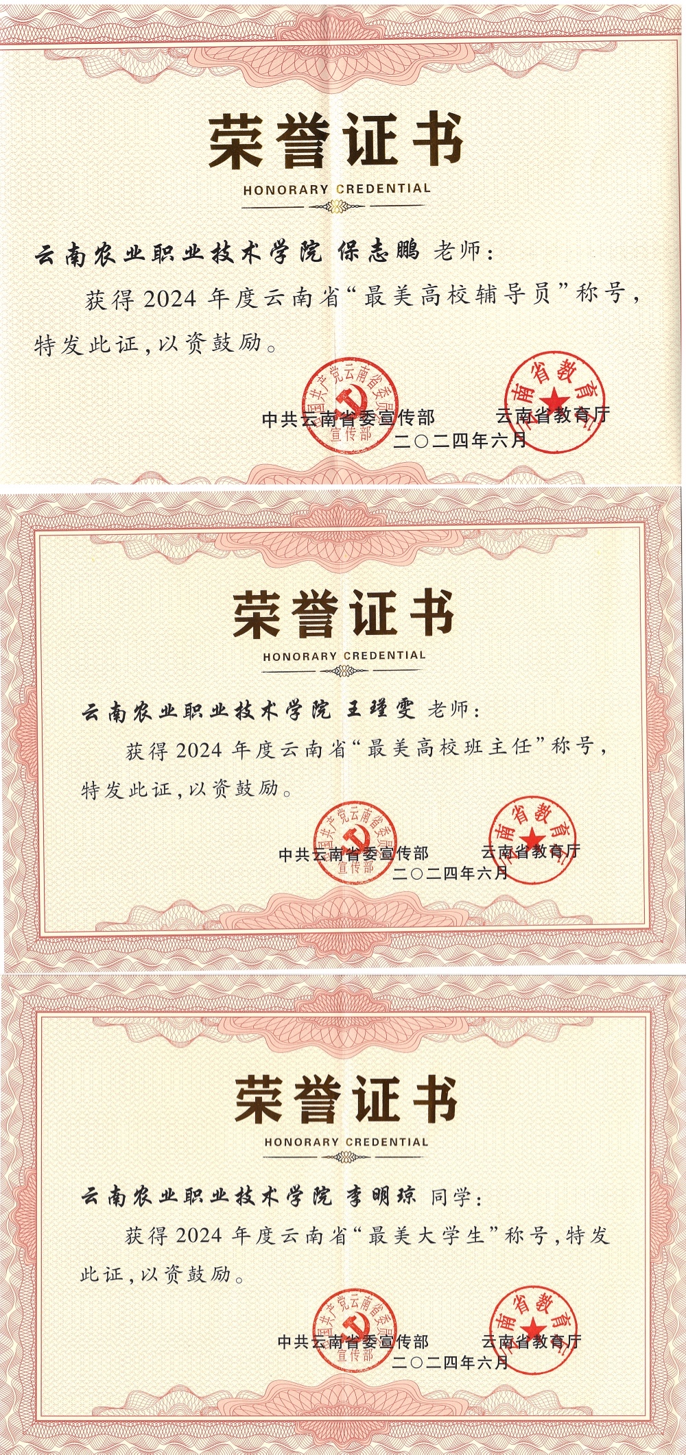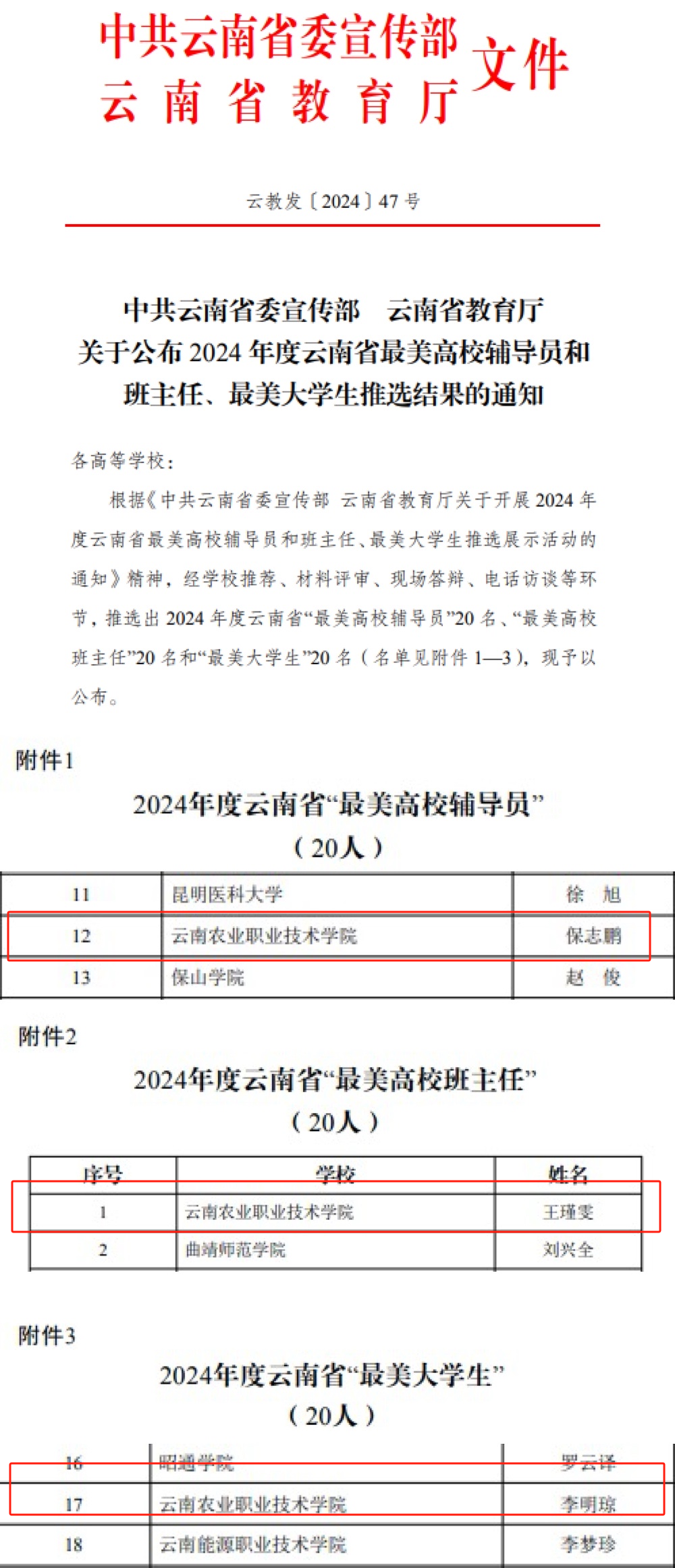 通知中心近期,根据《中共云南省委宣传部 云南省教育厅关于开展2024年度云南省最美高校辅导员和班主任,最美大学生推选展示活动的通知》精神,经过学校推荐、材料评审、现场答辩、电话访谈等环节,中共云南省委宣传部、云南省教育厅公布2024年度云南省最美高校辅导员和班主任,最美大学生推选结果,我院教师保志鹏荣获2024年度云南省“最美高校辅导员”称号,教师王瑾雯荣获“最美高校班主任”称号,食品药品与大健康学院李明琼同学荣获“最美大学生”称号。