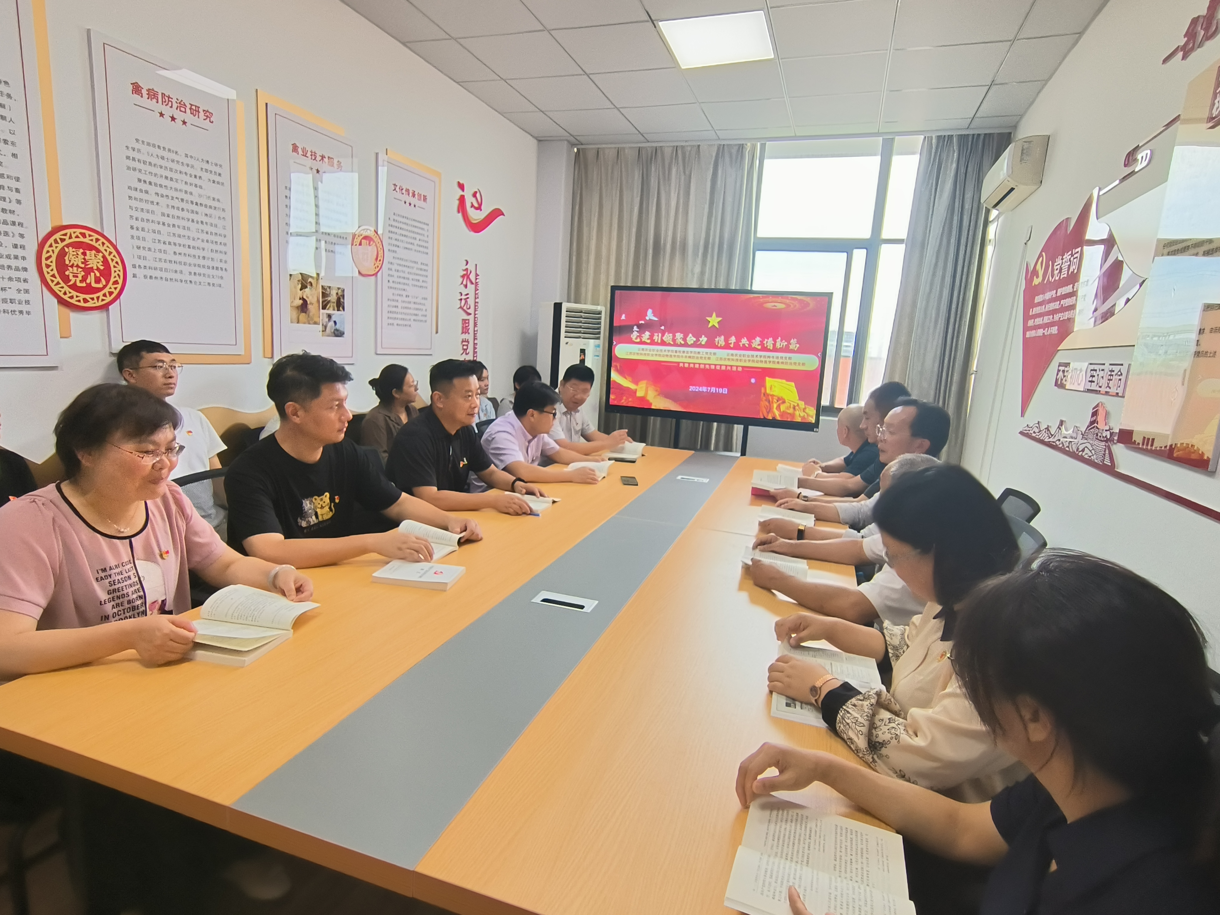 7月19日,在江苏农牧科技职业学院动物医学院考察交流期间,我院畜牧兽医学院党支部、种牛场党支部与江苏农牧科技职业学院牛羊病防治党支部、禽病防治党支部开展了以“党建引领聚合力 携手共建谱新篇”为主题的共联共建创先锋促振兴活动,4个党支部的党员代表共同学习领会党的二十届三中全会精神,就党建引领专业建设、后期共联共建等问题进行了交流探讨。