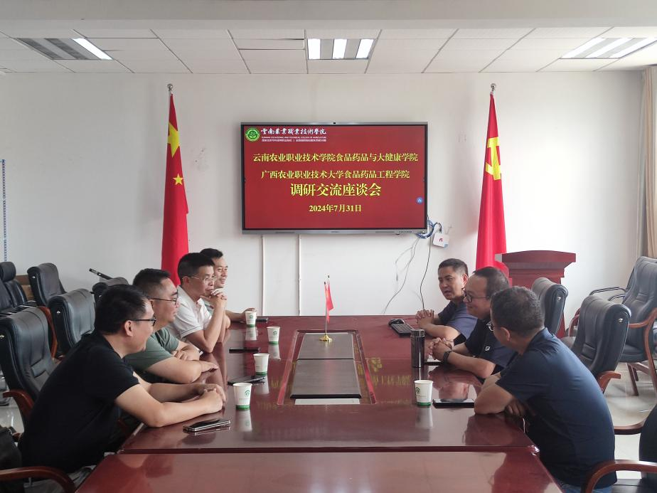 座谈会上,食品药品与大健康学院负责人详细介绍了本学院的发展历程、办学特色以及在教学、科研和社会服务等方面所取得的成绩。广西农业职业技术大学食品药品工程学院赵俊杰副院长、陈睿博士也分享了学校在农业职业教育方面的经验和做法,双方就如何进一步加强合作、共同推动农业职业教育的发展进行了深入探讨。