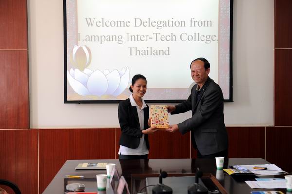 何明东副院长首先致欢迎辞。他代表学院热烈欢迎泰王国南邦国际技术大学(LIT)MR.NIMIT JIVASANTIKARN董事长率领的五人访问团对我院的交流访问。何副院长向客人介绍了我院悠久而光辉的办学历史,改革发展、专业设置、培养目标、师资队伍、系部建设、学生来源、就业情况等。何副院长着重介绍了学院对外交流合作的成果,特别是近些年与泰国七所农业技术学院多批次互派留学生学习交流,建立了互信共赢、取长补短、共同促进发展的深度友好合作关系,在云南的高职高专院校中独树一帜。何副院长强调,要进一步借助云南省桥头堡建设的有利时机,继续把与东南亚国家,特别是与泰国的合作办学做好、做大、做强!