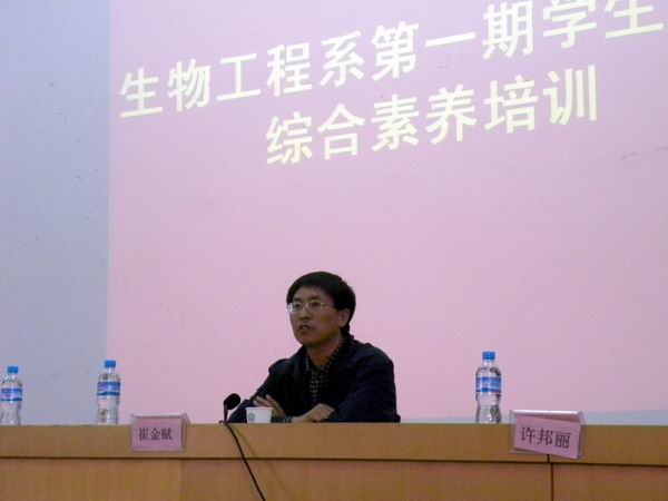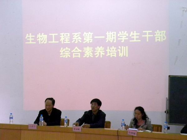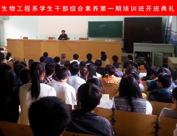 2013年5月6日,经过紧张的筹备,精心的组织,生物工程系学生干部第一期综合素养培训班在小哨校区农艺楼阶梯教室正式开班。生物工程系特邀学院党委书记崔金赋同志出席开班仪式,并请崔书记为学生做了专题讲座。