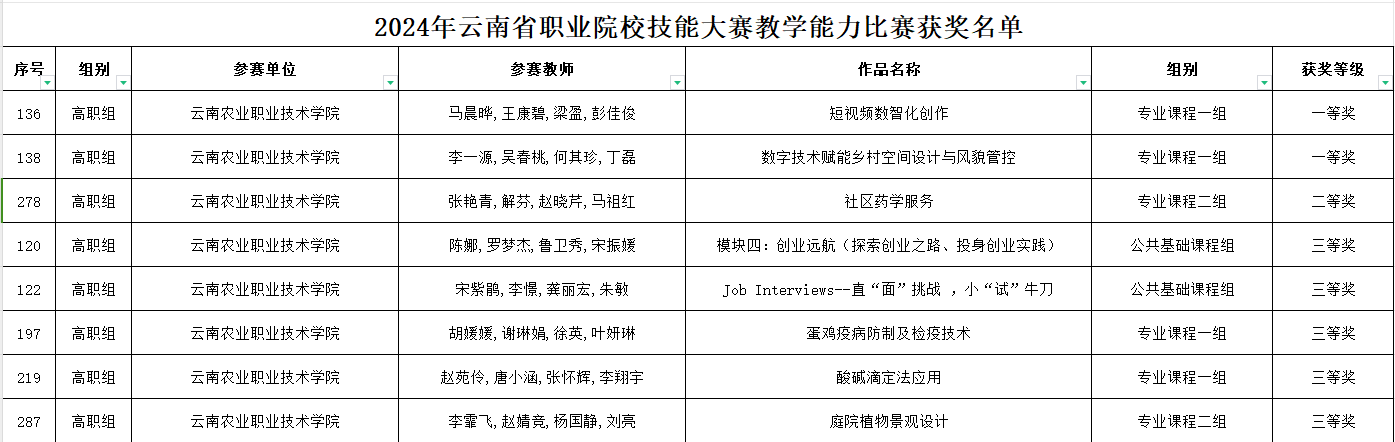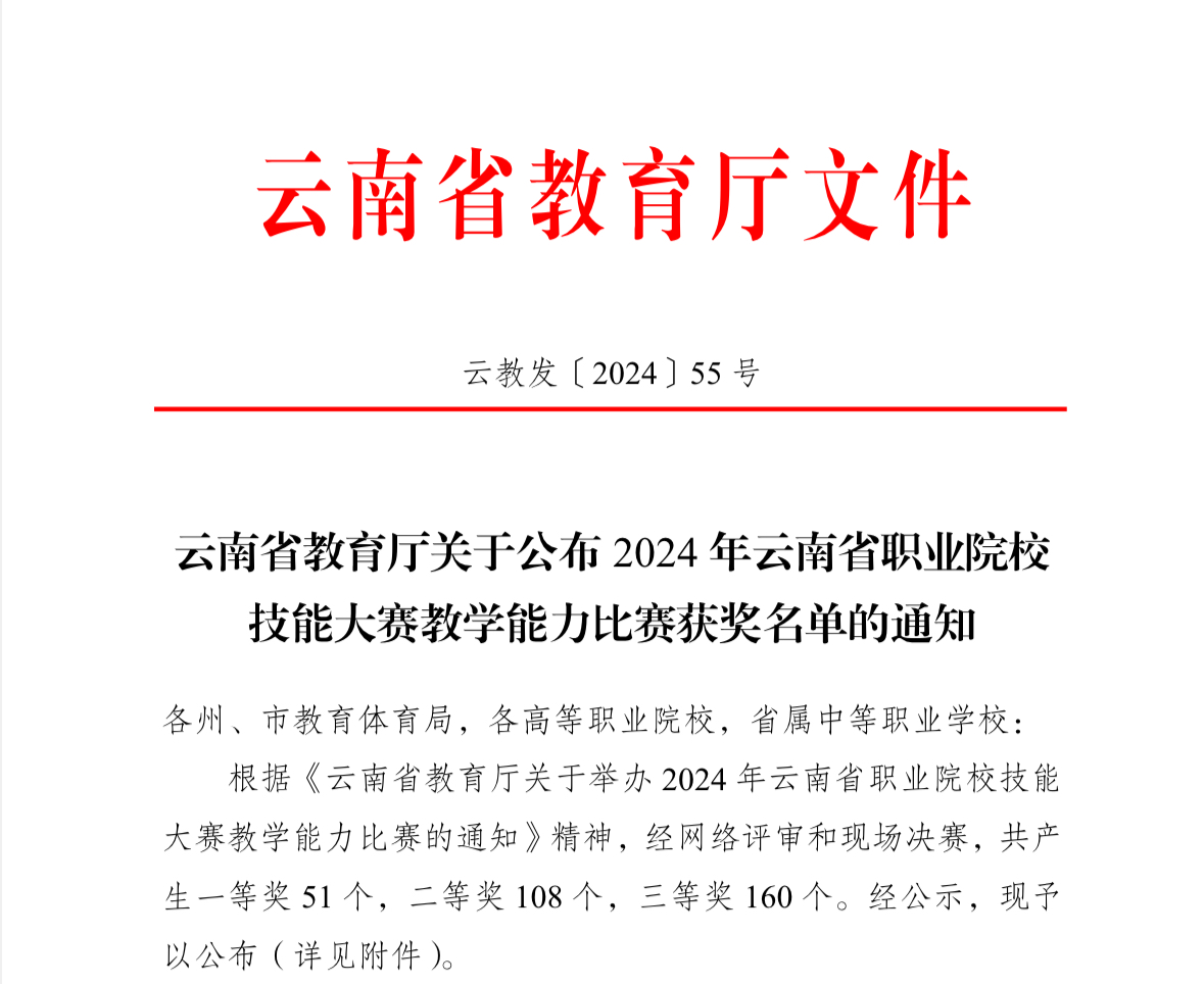 通知中心近日,云南省教育厅公布了2024年云南省职业院校技能大赛教学能力比赛获奖名单,本次比赛全省共有来自49所高职院校的356个团队参加。我院教师凭借良好的团队精神、扎实的教学功底,喜获2个一等奖、1个二等奖、5个三等奖的好成绩。