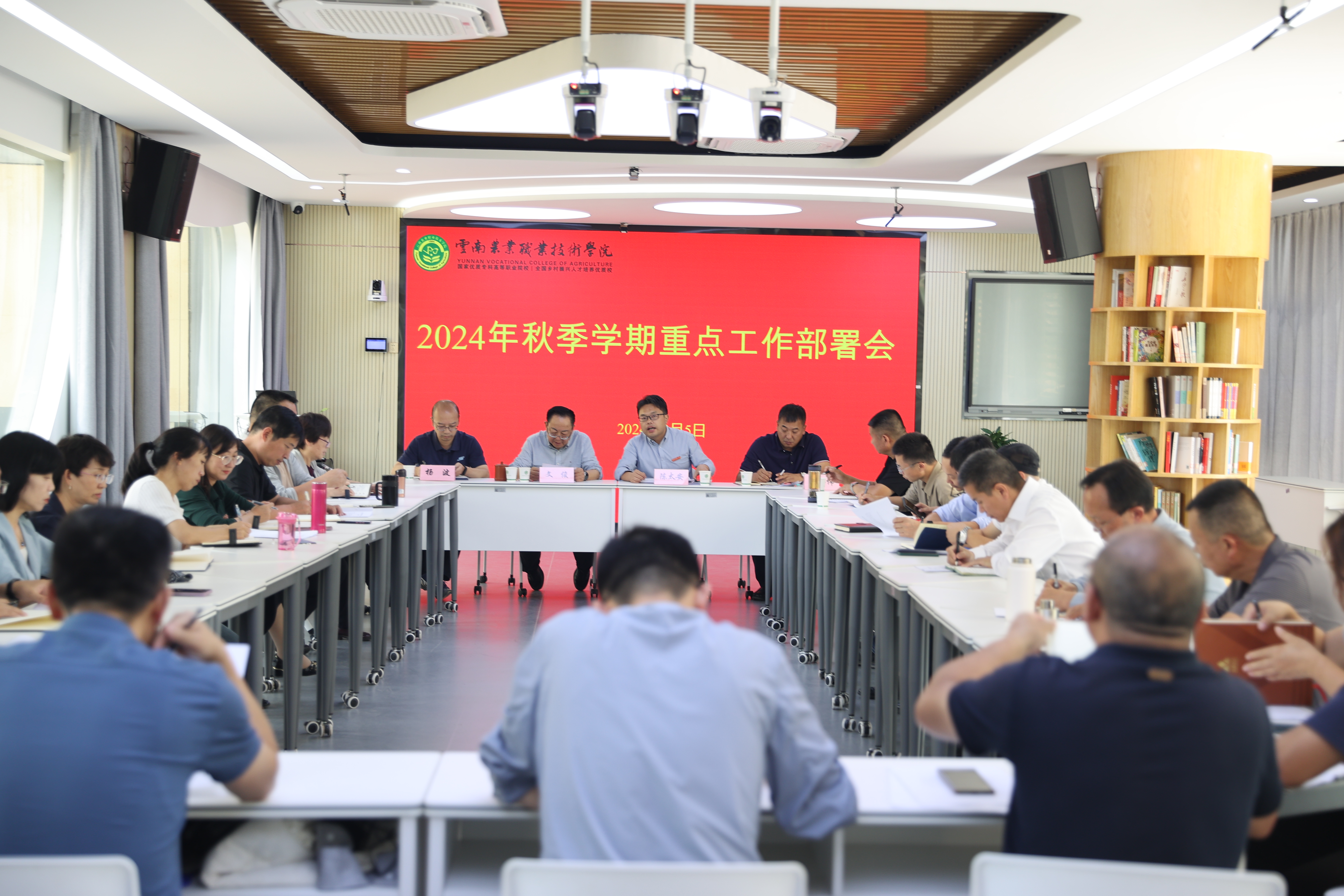 会议从八个方面对秋季学期重点工作进行了部署。一是以“新双高”申报工作为引领,全面加速高质量发展进程。继往开来,科学盘点、明晰目标、对标对表,深度服务高原特色农业产业,强化保障、细化措施,项目化推进申报工作。二是以专业综合评价工作为抓手,全面推进“五金”建设。要对照专业综合评价指标体系,以职业教育规律为指引,把握好农科职业教育特点,起底梳理专业建设工作成效,抓好职业技能大赛、教学能力大赛等重点工作,全力实现专业建设标志性成果的新突破。三是以做优做强农科特色为目标,进一步完善和发展“强农优工精商”的专业体系。要毫不动摇地坚持专业建设在办学治校中的龙头地位,强化专业布局的聚焦发展、特色发展、错位发展,推动“农业+”“+农业”专业建设理念的落细落实。四是以持续实施人才强校战略为工作主线,引培并举做大做强学院高质量发展的第一资源。要建章立制,全面细致做好人才“引、培、用”工作,推动师资队伍的分类分层建设。五是以办学资源优化整合为重要途径,着力提升办学治校的核心保障能力。要加强校级层面对实习实训基地、科技创新平台、生产性实习基地的统筹建设力度,确保资源的高效利用。六是以深入实施“伙伴计划”为切入点,着力推进产教融合有特色有影响的高质量。要在学校、学院、专业、教师四个层面上精准做实政行校企合作,促进产业链、创新链、人才链、教育链的深度融合。七是以深化人事制度改革为关键,进一步激发教师创新创造活力。要强化学习和沟通,科学做好绩效分配、职称评聘、年度目标责任制考核等改革工作。八是以办好办学120周年系列活动为契机,着力重塑云农职高质量办学品牌。要以总结经验、凝聚人心,强化交流,谋划未来,汇聚资源、加快发展为出发点和落脚点,精心组织、简朴庄重地办好办学120周年系列活动。