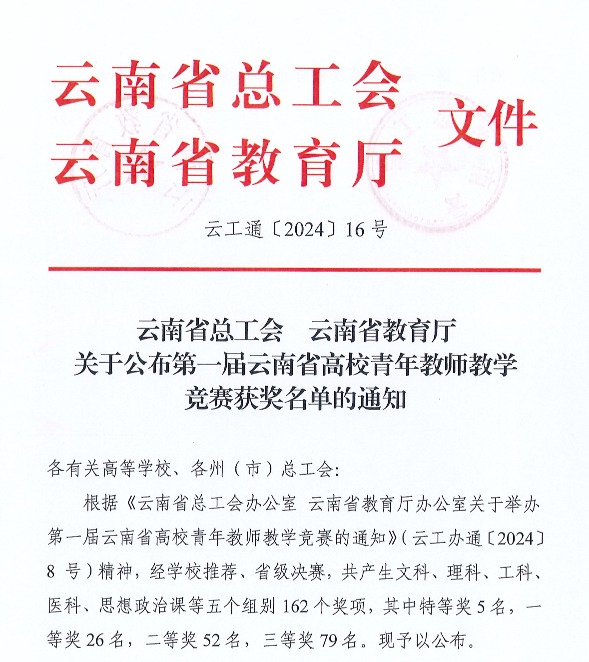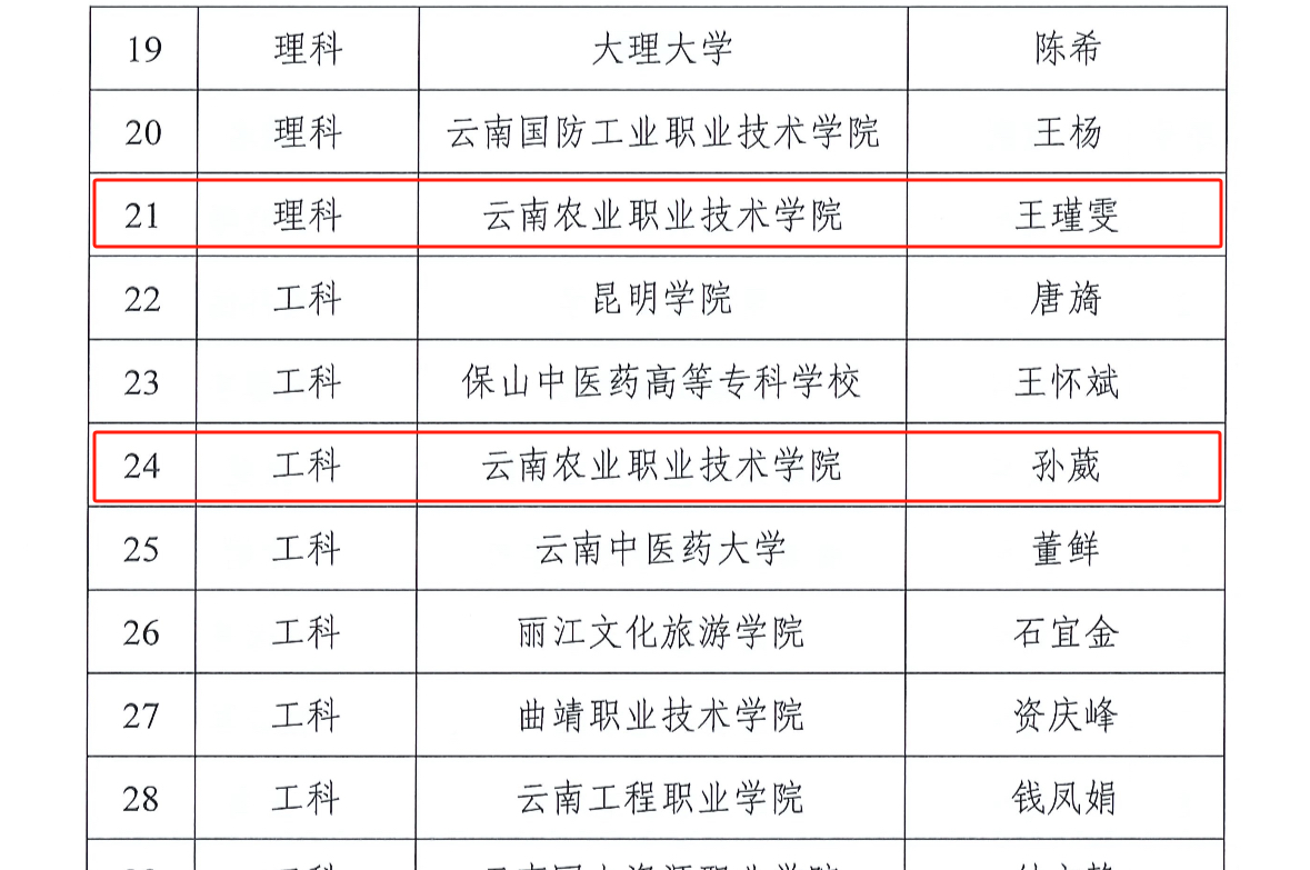 近日,云南省总工会、云南省教育厅公布第一届云南省高校青年教师教学竞赛获奖名单,进学校推荐、省级决赛,共产生文科、理科、工科、医科、思想政治等五个组别162个奖项。我院教师王瑾雯荣获理科类二等奖、孙葳荣获工科类二等奖、徐率荣获医科类三等奖。