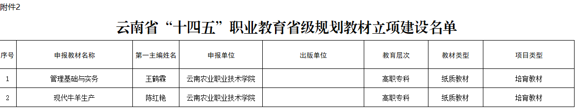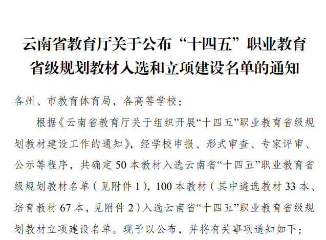 通知中心近日,云南省教育厅公布了“十四五”职业教育省级规划教材立项建设名单。本次共确定100本教材入选云南省“十四五”职业教育省级规划教材立项建设名单。经学校申报、形式审查、专家评审、公示等程序,beat365官网2部教材进入云南省“十四五”职业教育省级规划教材立项建设名单。这一成果既是对beat365官网教育教学水平的权威性认证,也是教师卓越教学能力与深厚教学功底的深层次展现。