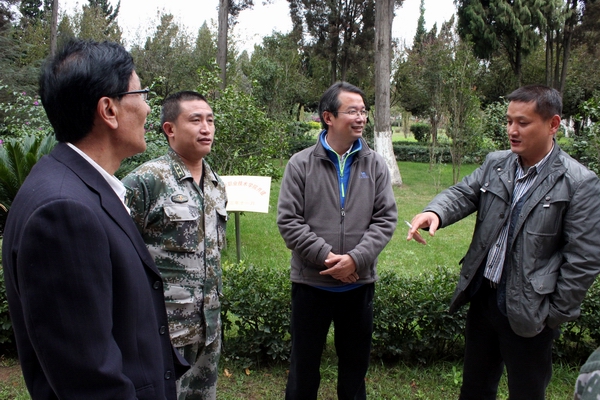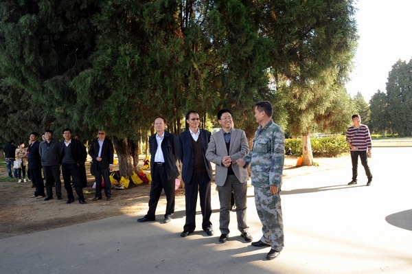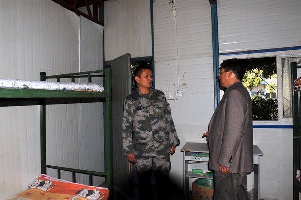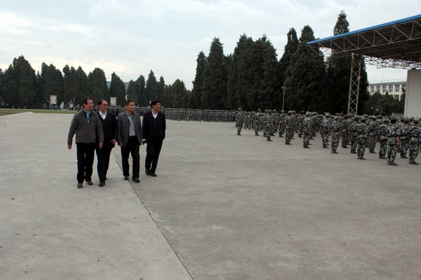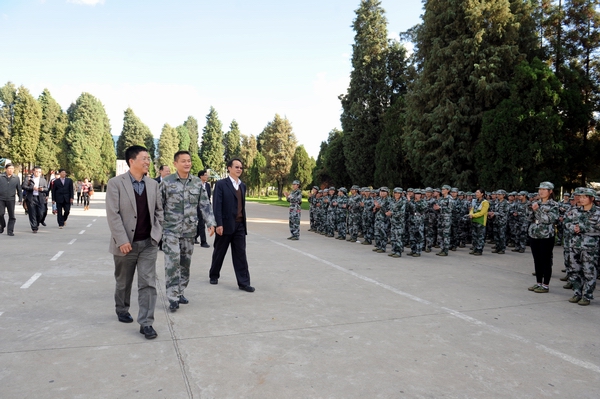 11月4日,学院党委书记崔金赋、院长李永忠在保卫处长李昆、昆明民族干部学院一大队副大队长熊云海的陪同下,分别深入军训基地视察慰问驻训教师及参训学员,并察看2014级学生的军训情况。学院副院长何明东、赵莉、俞浩及各系部党总支书记等领导老师参加了慰问活动。大家听取了学院驻训工作小组的工作汇报,并来到训练场地查看了各系参训学生的参训情况,随后查看了学生宿舍。同学们看到各位领导前来看望都非常激动。