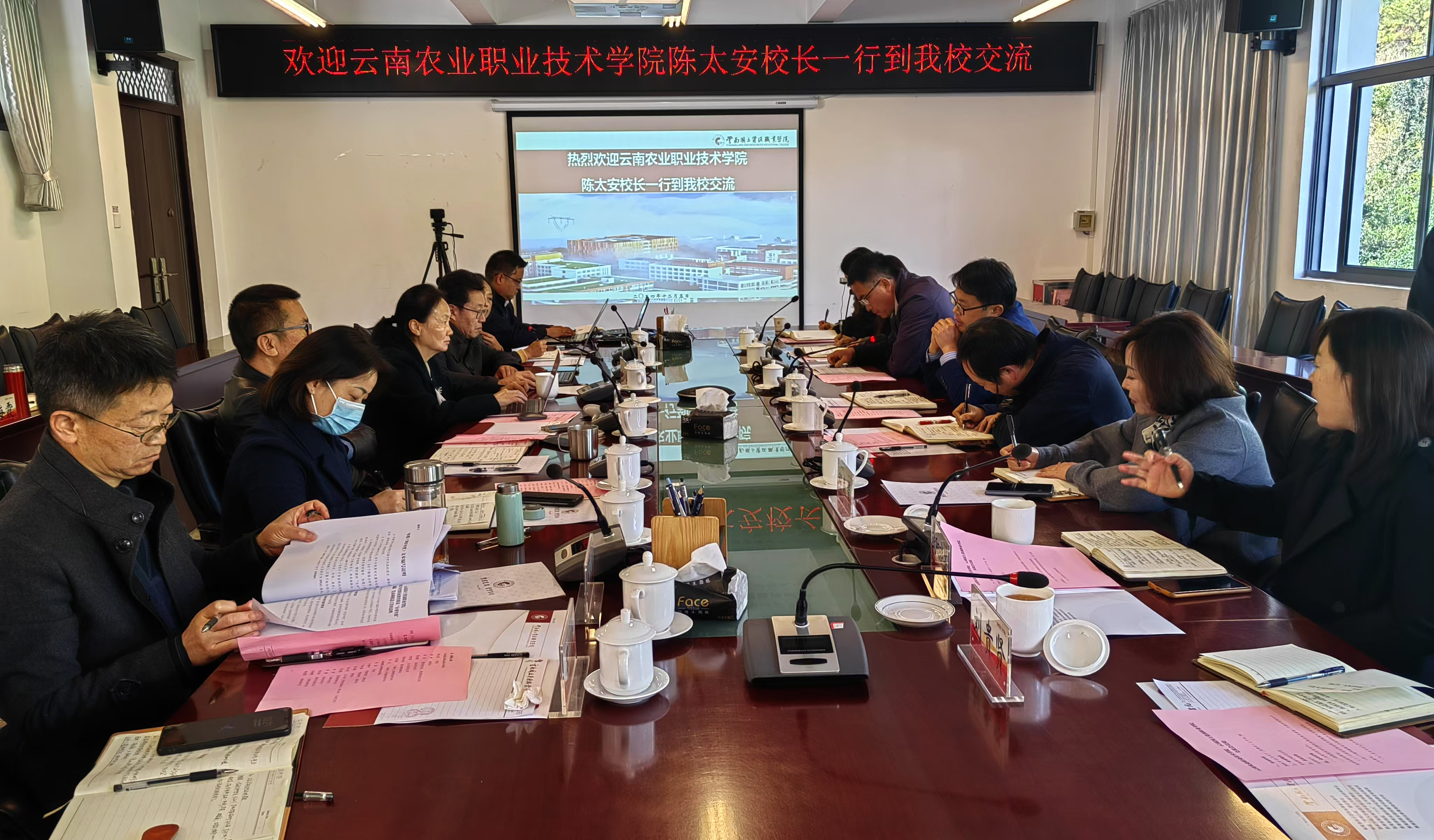 125上午校长陈太安、副校长杨涛率办公室、组织部、教务处、发展规划办、财务处、人事处等部门同志一行8人赴云南国土资源职业学院开展交流座谈云南国土资源职业学院校长陈颖,副校长寸建平、齐武福、张云霞以及办公室(党委巡察办)、组织部、发展规划处、人事处、教务处负责人及有关工作人员参加座谈。
