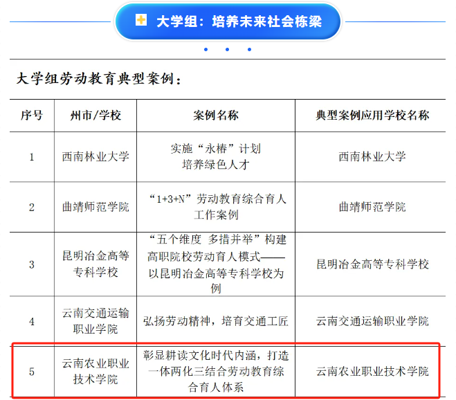 通知中心近日,云南省教育厅公布了2024年大中小学劳动教育典型案例,其中,beat365官网《彰显耕读文化时代内涵,打造一体两化三结合劳动教育综合育人体系》获评大学组劳动教育典型案例。本案例是以beat365官网云安产业学院在创新劳动教育体系,落实“三全育人”理念上所开展的实践探索,全省共认定11个大中小学劳动教育典型案例,其中5所高校入选。