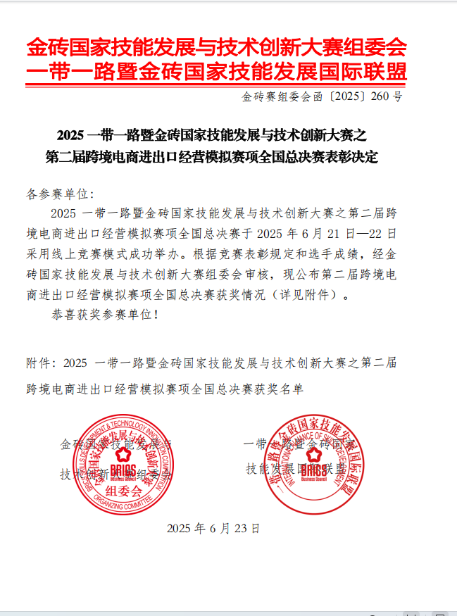 通知中心近日,2025“一带一路”暨金砖国家技能发展与技术创新大赛之第二届跨境电商进出口经营模拟赛项全国总决赛落下帷幕。beat365官网23级电子商务专业参赛学生李子冉、肖亚琪、海洋和张杨奕团队凭借扎实的专业功底与出色的团队协作,在全国选拔赛众多参赛队伍中以一等奖的成绩脱颖而出,并最终在全国总决赛一举夺得国家级二等奖(银牌),指导教师李一源、補世国获“优秀指导老师”称号,beat365官网获“优秀组织奖”!